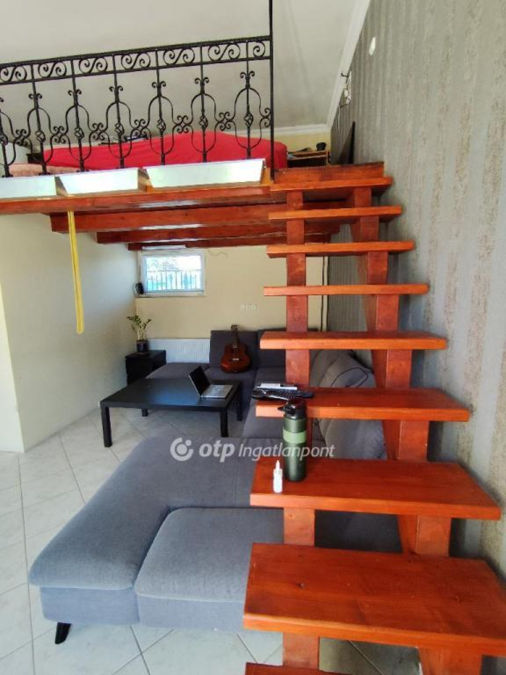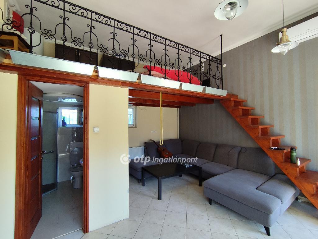 Elrendezése: nappali, konyha, zuhanyzós fürdő, a nappali és konyha felett 12 nm-es hálószobaként funkcionáló galéria.