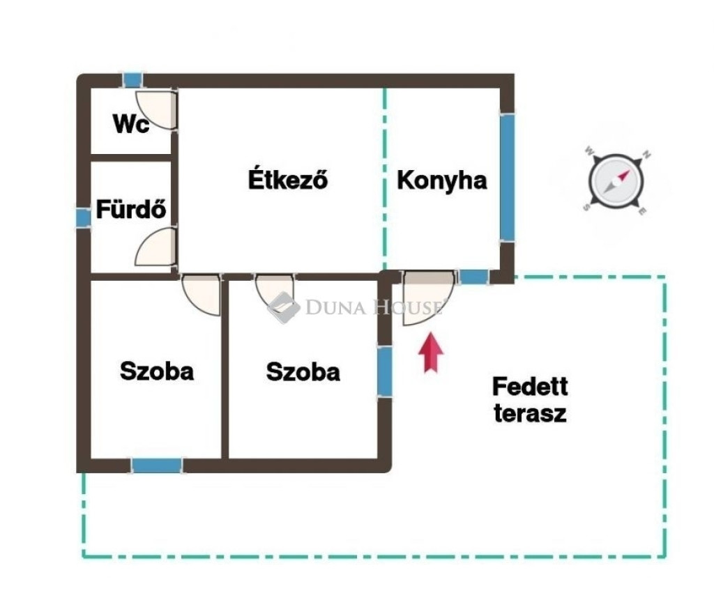 Az ingatlanban: 2 szoba, étkezős konyha, wc, fürdőszoba és 16 m2-es terasz található.