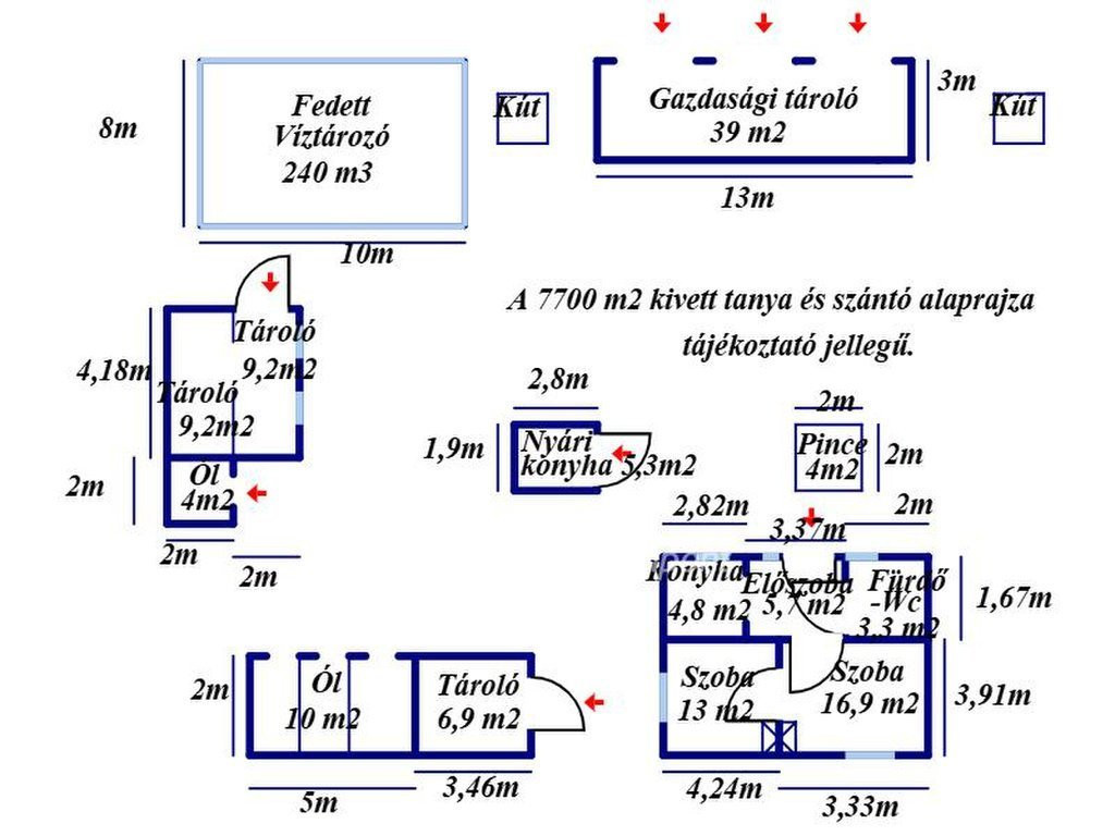 Bács-Kiskun vármegye, Lajosmizse külterületén kivett tanya és szántó megnevezésű ingatlan 45 m2 hasznos nettó alapterületű lakó- és gazdasági épületeivel 7700 m2-es telken eladó! Az 1950-ben épült száraz, vegyes falazatú épület stukatoros fa födémmel, fa tetőszerkezettel és hullámpala héjazattal készült, a homlokzat jó állapotú, festett. A lakóépület két szobából, egy konyhából, egy fürdőszoba-WC helyiségből és egy előszobából áll. A helyiségek beton-, járólap- és PVC borításúak. A külső- és belső nyílászárók normál fa szerkezetűek. A közművek közül az ingatlanban az egyfázisú villany (16 Amper) rendelkezésre áll, emellett két házi vízművel ellátott fúrt kút is található. A víz-ellátás az épületben bevezetésre került, emésztő az udvaron kiépített. A tanya területén több gazdasági épület, két tároló, egy nyári konyha, állattartásra alkalmas ólak, 40 m2 nagyságú terménytároló, egy 240 m3 nagyságú fedett víztározó, valamint egy 4 m2 nagyságú pince is rendelkezésre áll. Az otthon melegéről beszerelhető kandalló vagy kályha gondoskodhat, melyhez a vegyestüzelésű kémény kiépített. A melegvíz ellátására villanybojler beszerelésre került. Az ingatlan jelen állapotában kis ráfordítással lakhatóvá tehető.