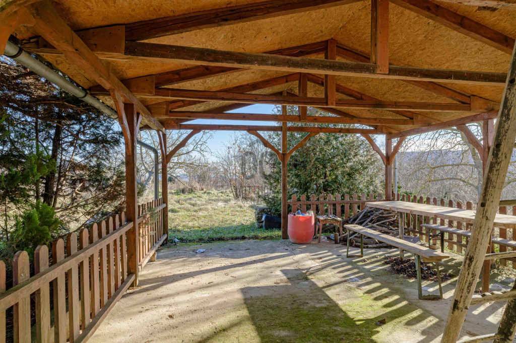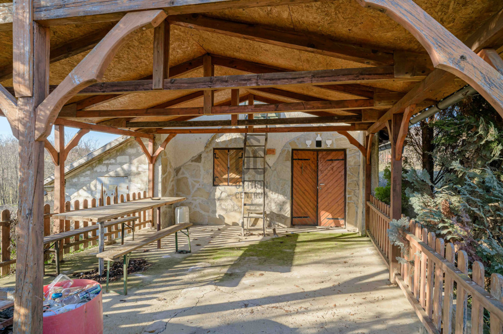 A bejárat előtt egy viszonylag jó állapotú, 22.5m2-es fából ácsolt fedett terasz áll.