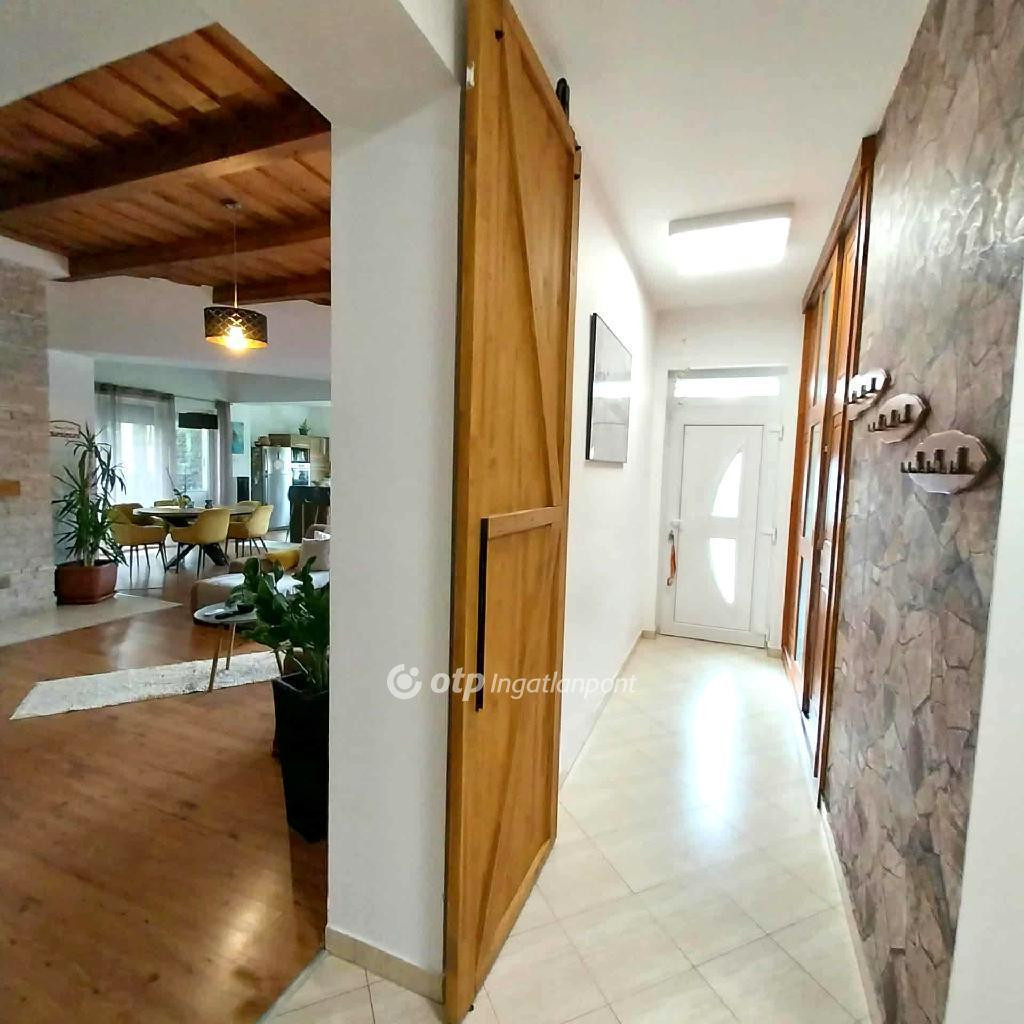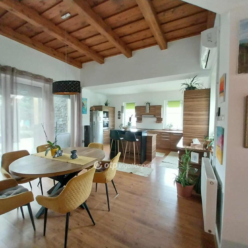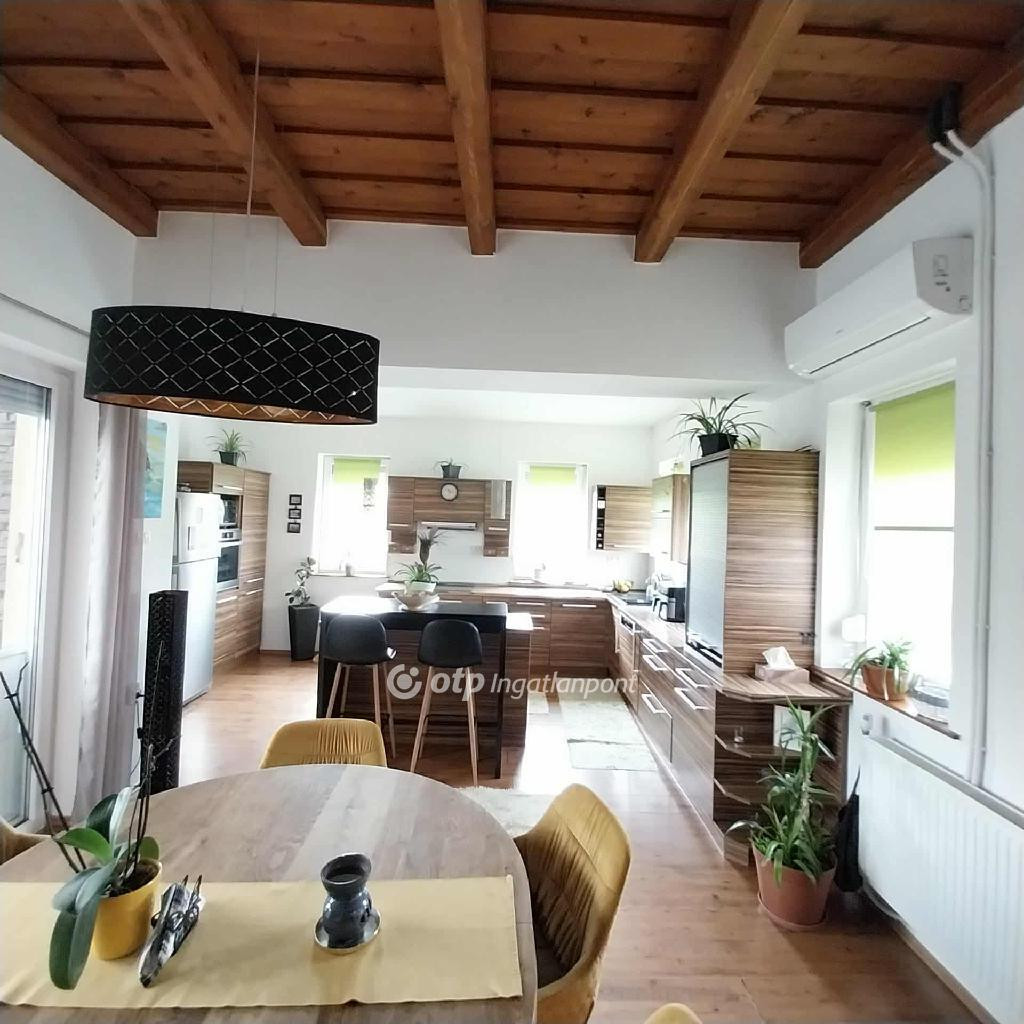 Amerikai konyhás nappali étkezővel, fedett terasz és kertkapcsolattal.