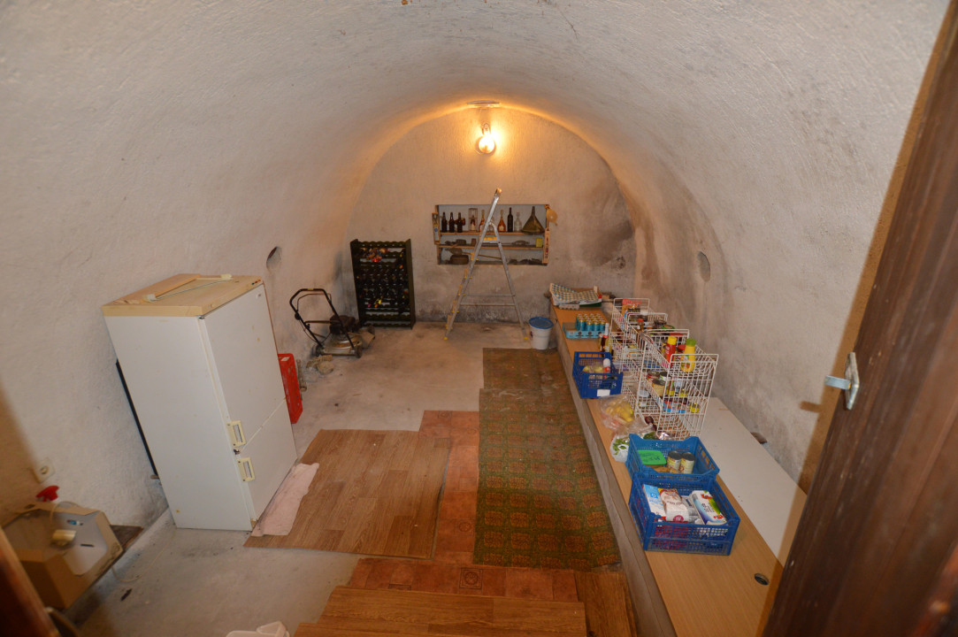 Balra nyílik egy föld alatti, bolthajtásos pince, kb. 12 m² alapterülettel.