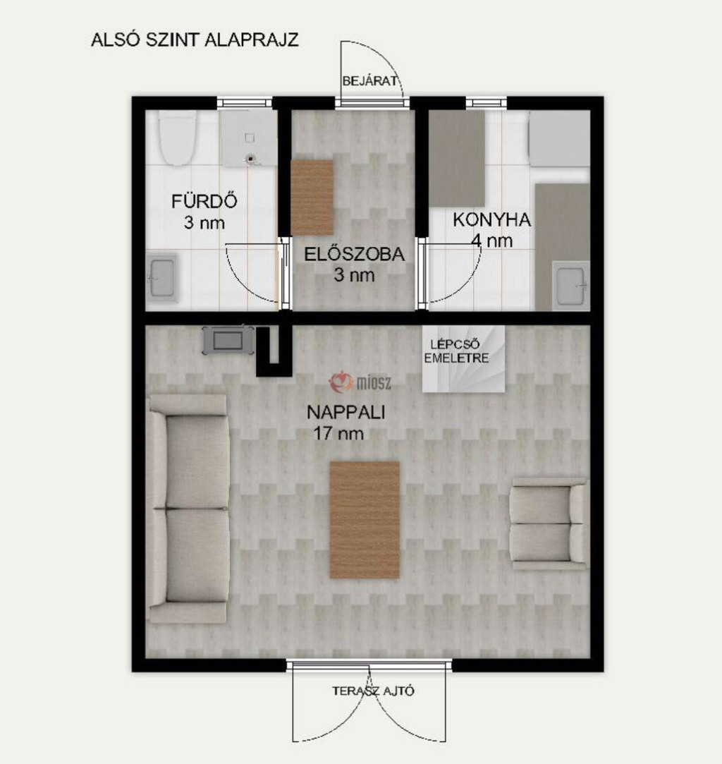 Az alsó szinten (ami 27 nm-es) van egy fürdőszoba, egy konyha egy nagy nappalival.