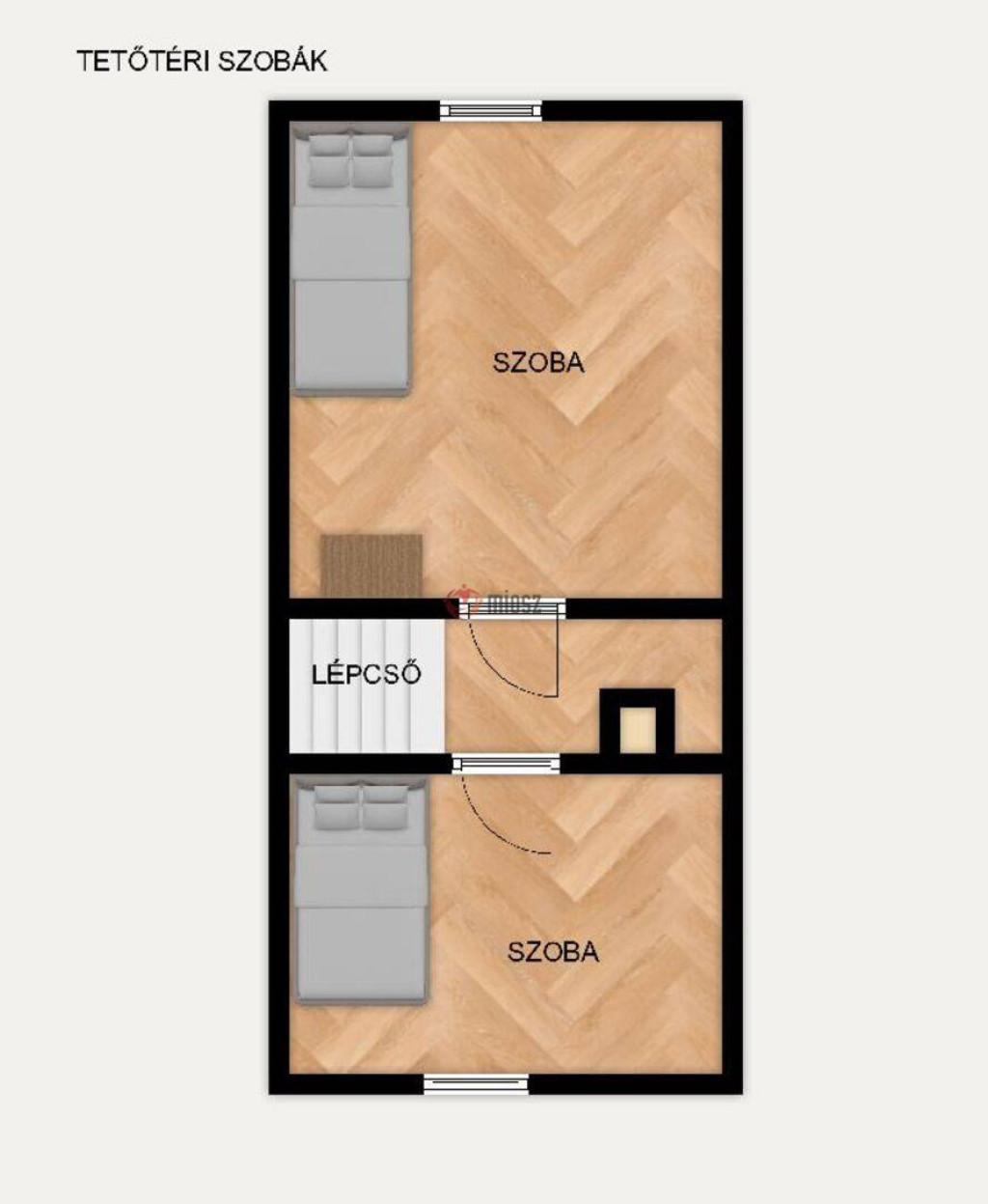 A normál méretű lépcsőn megyünk fel a felső szintre, ahol a tetőtér beépítésével 2 szoba került kialakításra.
