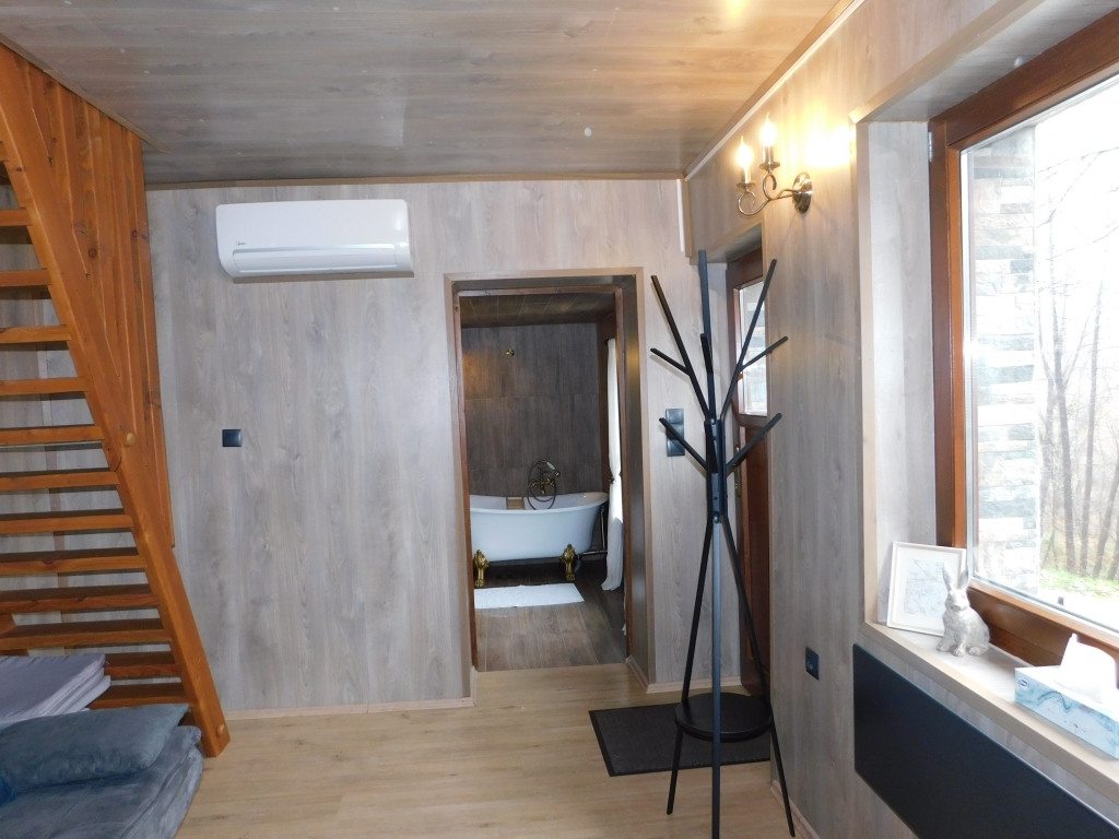 - a földszinten nappali-konyha-étkező, fürdőszoba és wc egyben, a galérián pedig a hálótér került kialakításra
