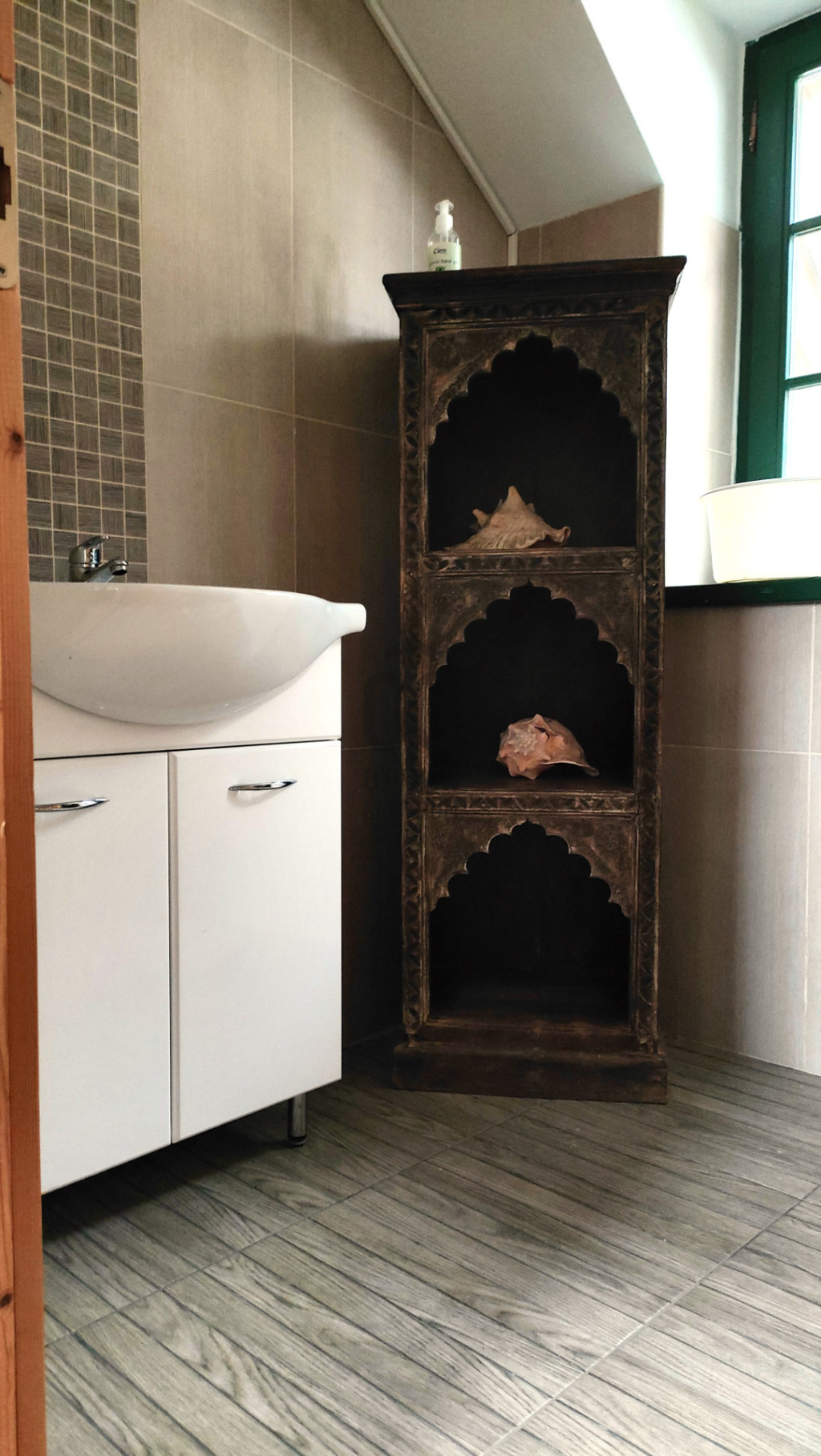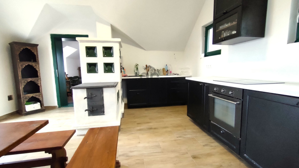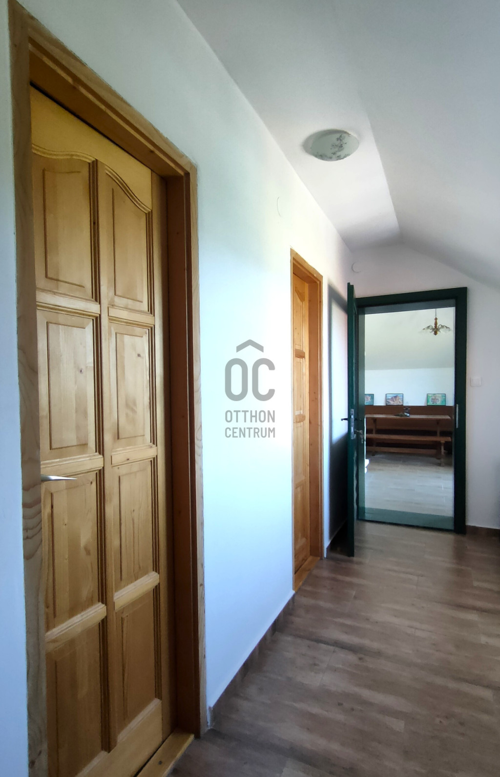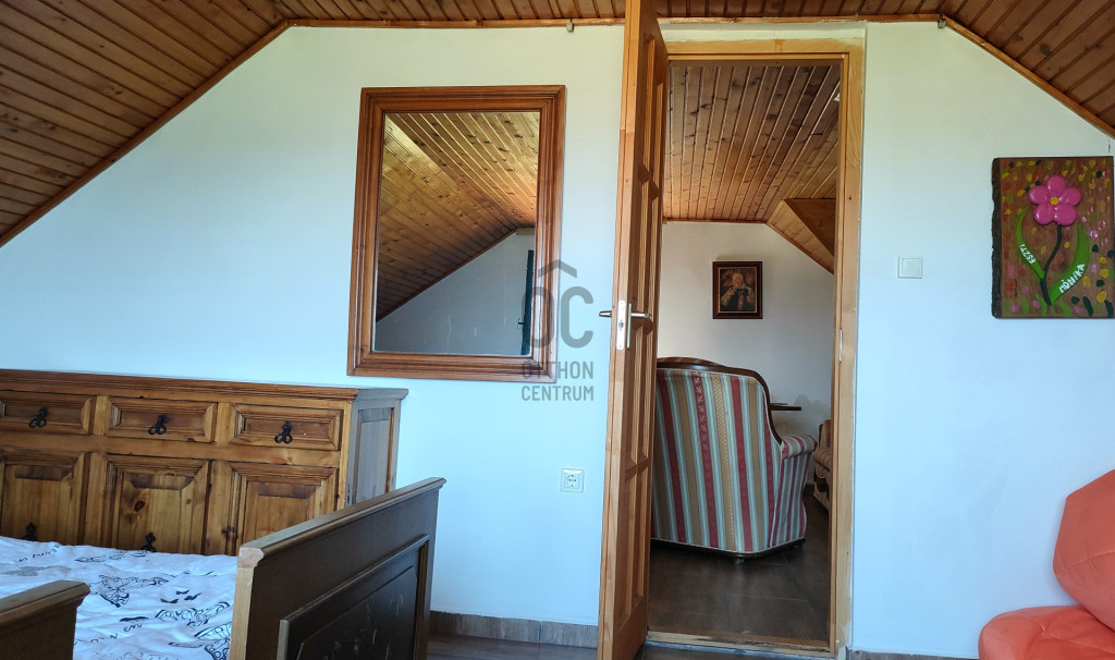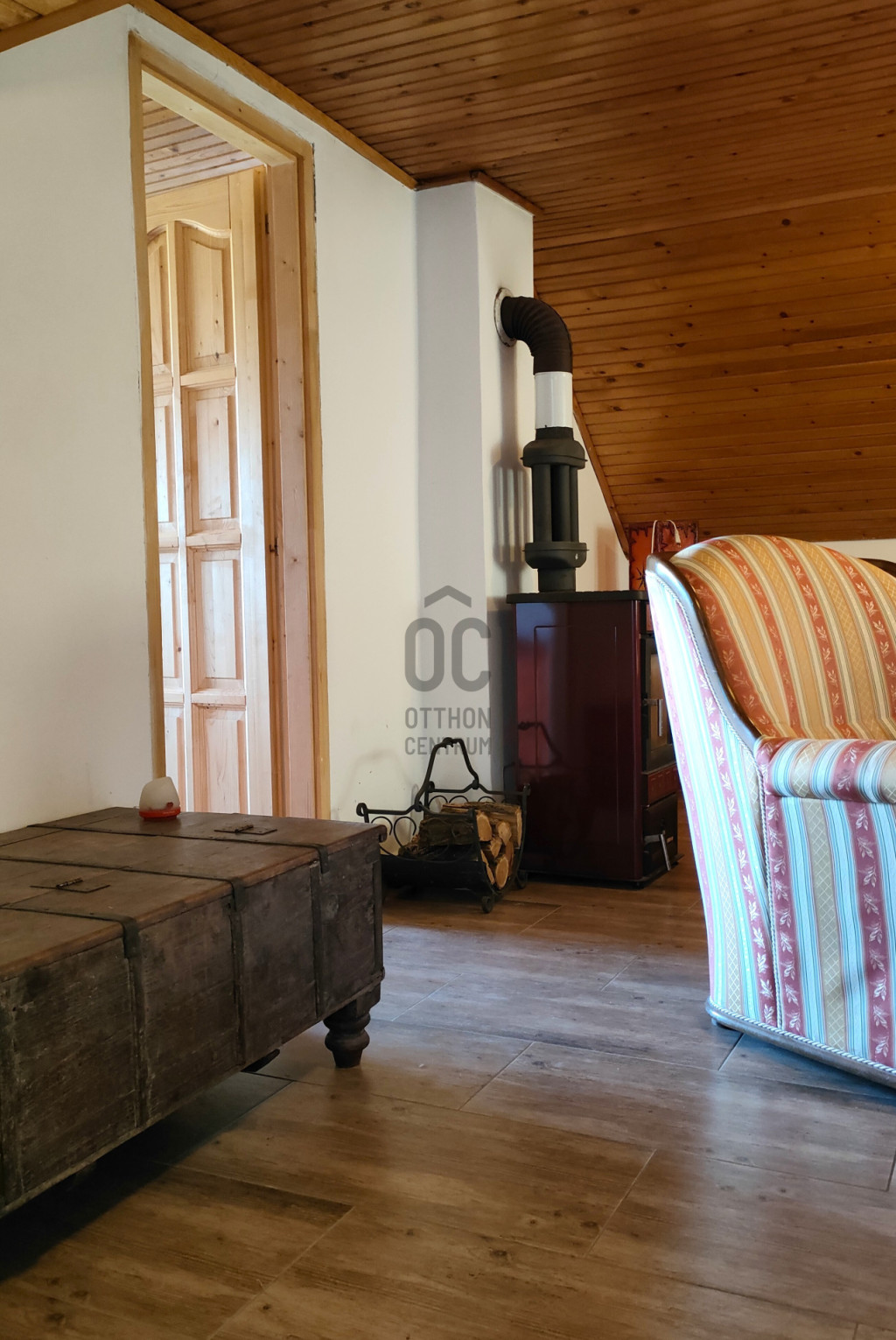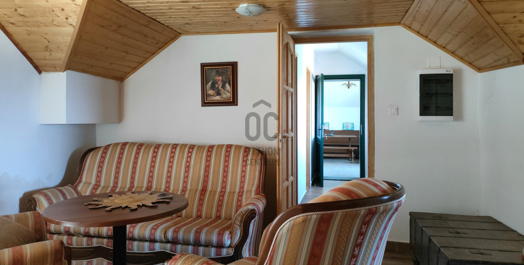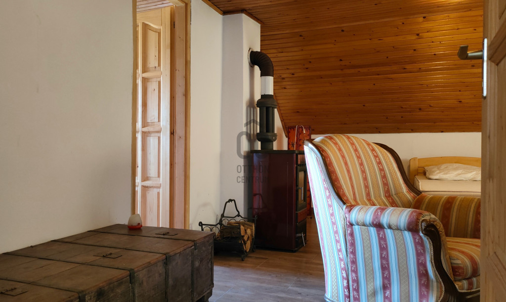 A 39 m2-es földszinten jelenleg egy 17 m2-es konyha, egy 9 m2-es tároló és egy 13 m2-es pince/gépház van. A földszint itt maga az emelt belmagasságú padlástér, melyben egy 25 m2-es konyha-étkező található egy új építésű csikótűzhely-kemencével, egy 4 m2-es fürdőszobával, egy szintén a folyosóról de külön nyíló 1,5 m2-es wc-vel, egy 19,6 m2-es szobával és egy ebből nyíló újabb 20 m2-es panorámás szobából áll.
