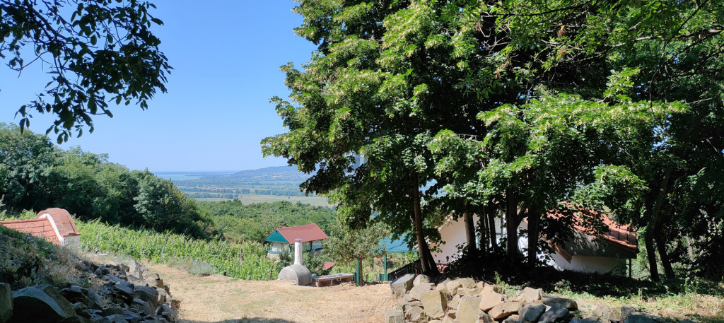 A kertben, a szőlősorok között kialakításra került egy Balatoni panorámával büszkélkedő kerti pihenő/ "fröccsterasz".
