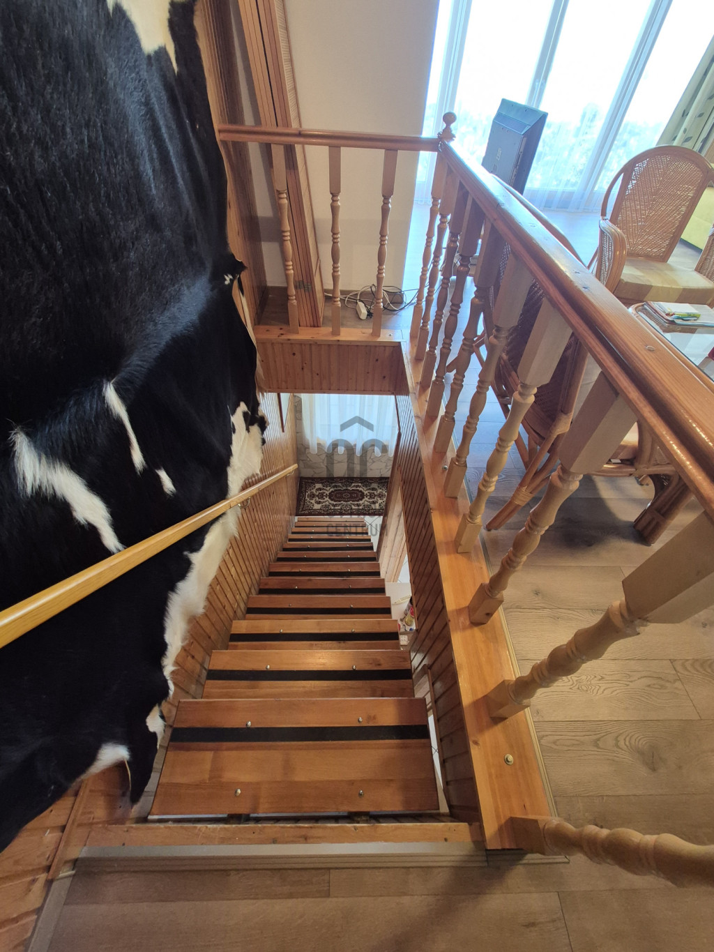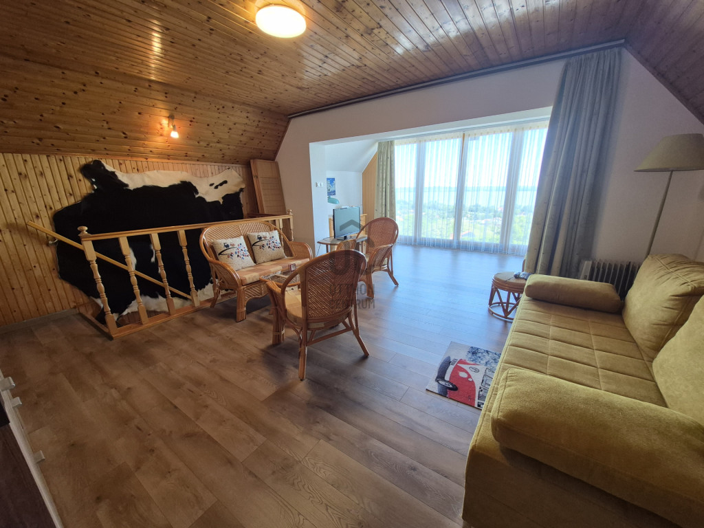 Az alsó szinten egy étkező-konyha-nappali fogad minket, mely közvetlenül kapcsolódik a 40nm-es teraszhoz, melynek minden pontjáról csodálatos panorámában gyönyörködhetünk.