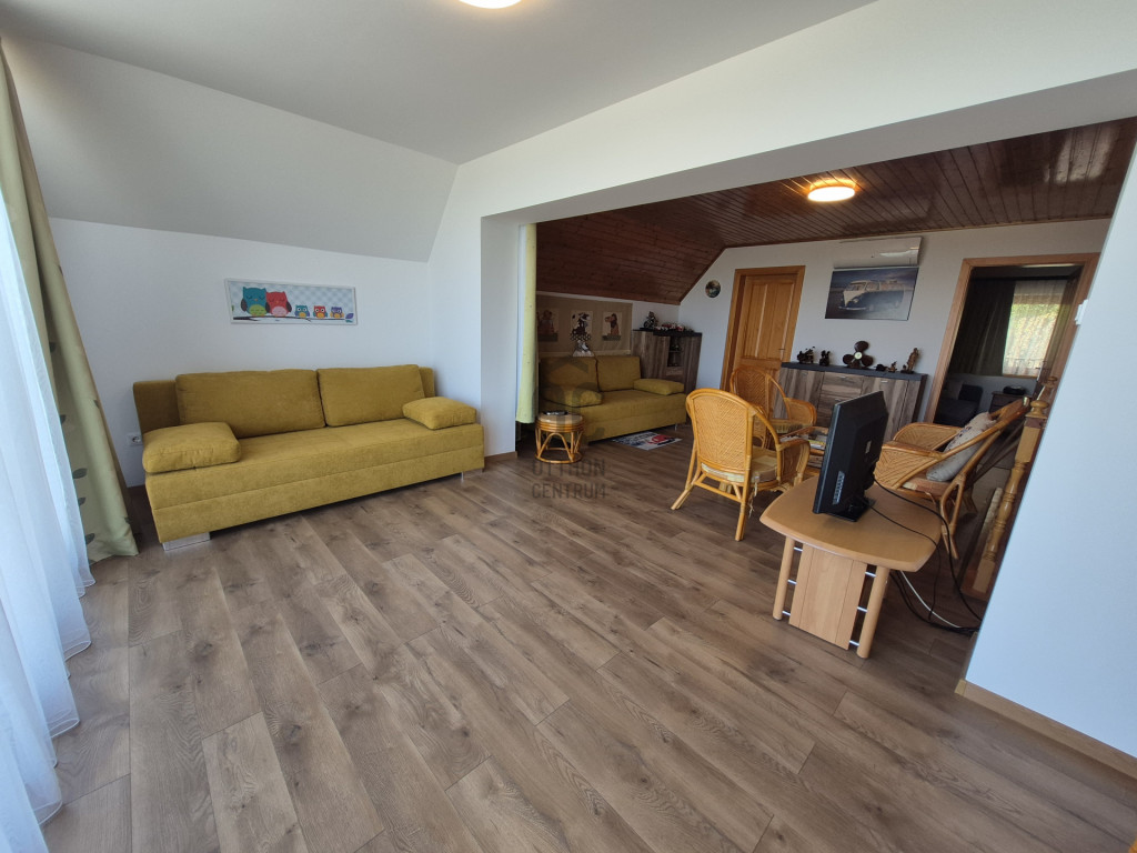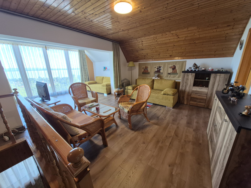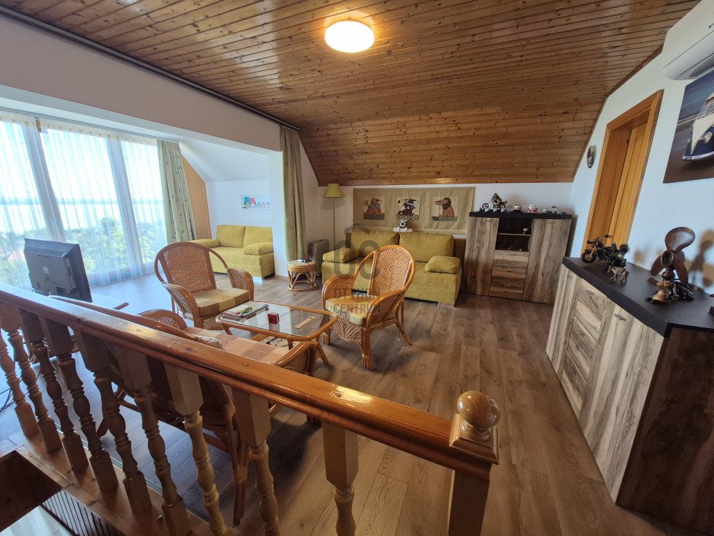 Az emeleten egy nagy, 35 nm-es nappaliból élvezhetjük a Tihanytól Fonyódig tartó balatoni panorámát egy hatalmas hővédő üvegfelületen keresztül, és emellett két hálószoba is található még ezen a szinten.
