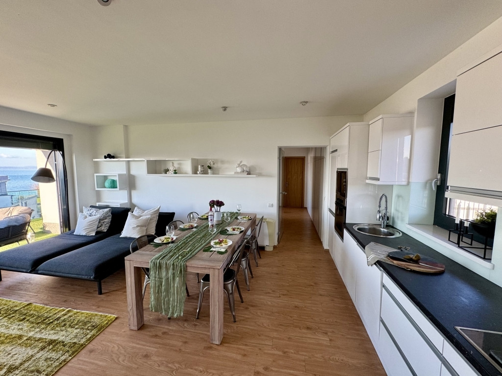 tágas 35 m2 nappali étkező konyha, kijárat a balatoni panorámás teraszra.