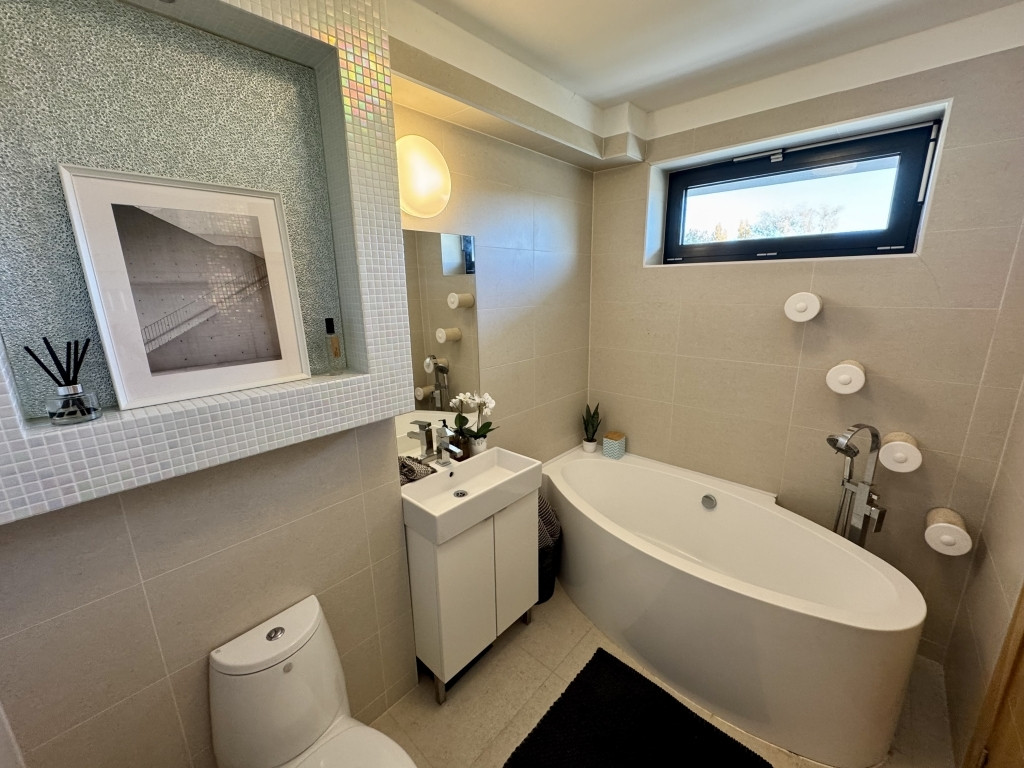 fürdőszoba, sarokkáddal és wc-vel.