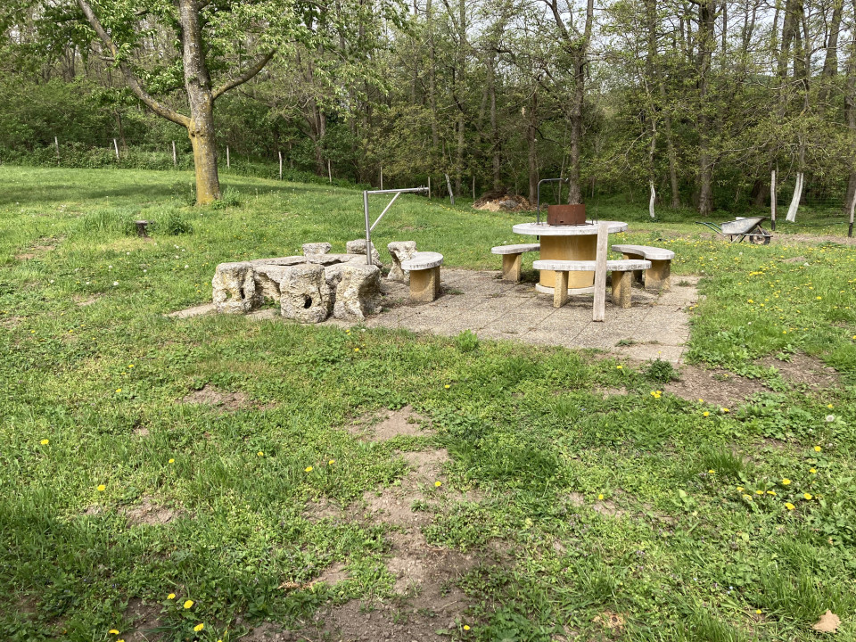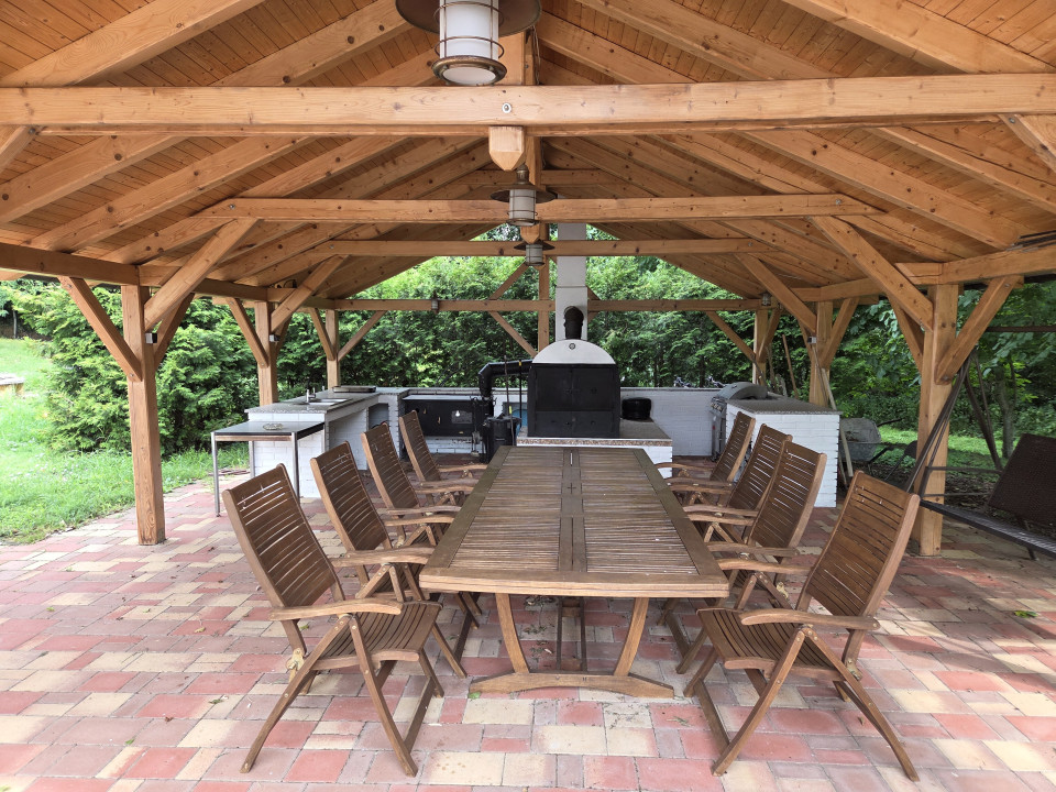 A ház mellett van egy fedett nyári terasz kemencével, sütögetővel.