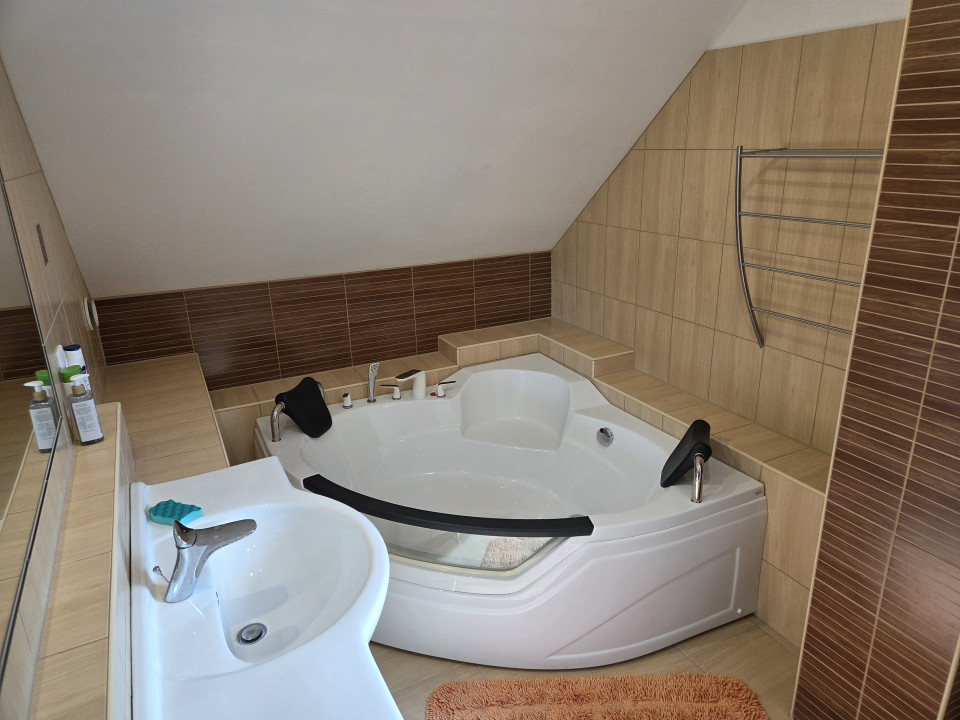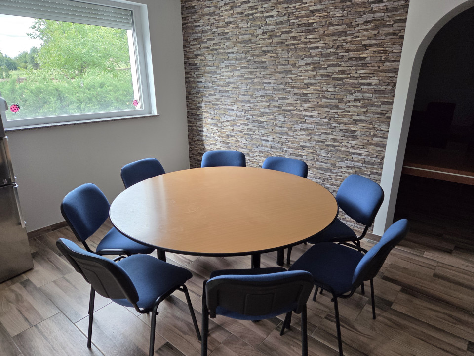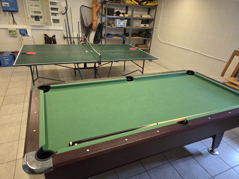 Az épület elosztása: konyha, nappali , étkező, kamra, 3 szoba, 2 fürdőszoba, garázs , egy kis növényház valamint szabadidőterem (pingpong és biliárdasztal)