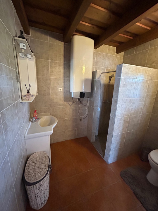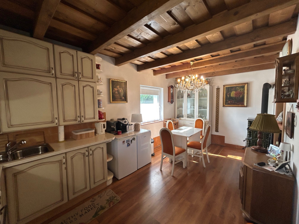 A 1464 m²-es telek gondozott, jelenleg szőlővel, gyümölcsfákkal és veteményessel beültetett, igazi vidéki hangulatot áraszt. A ház belső tere fa gerendás mennyezettel készült, amely meleg, otthonos atmoszférát teremt. A hőszigetelt nyílászárók mind árnyékolóval és szúnyoghálóval felszereltek. A fűtést fatüzeléses cserépkályha biztosítja, ami télen is kellemes meleget ad.