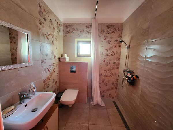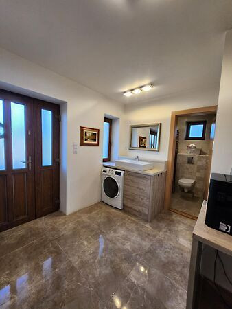 -Földszint: amerikai konyhás nappali, 1 db hálószoba, előszoba, zuhanyzós wc -s fürdőszoba, kamra. Kamrában található a kút hidroforja, kamerarendszer irányító egysége, és az Ariston vízmelegítő. A földszinten hűtő-fűtő klíma, 3db elektromos radiátor, 1db törölköző radiátor és kandalló szolgáltatja a meleget. Hidegburkolat, laminált padló.