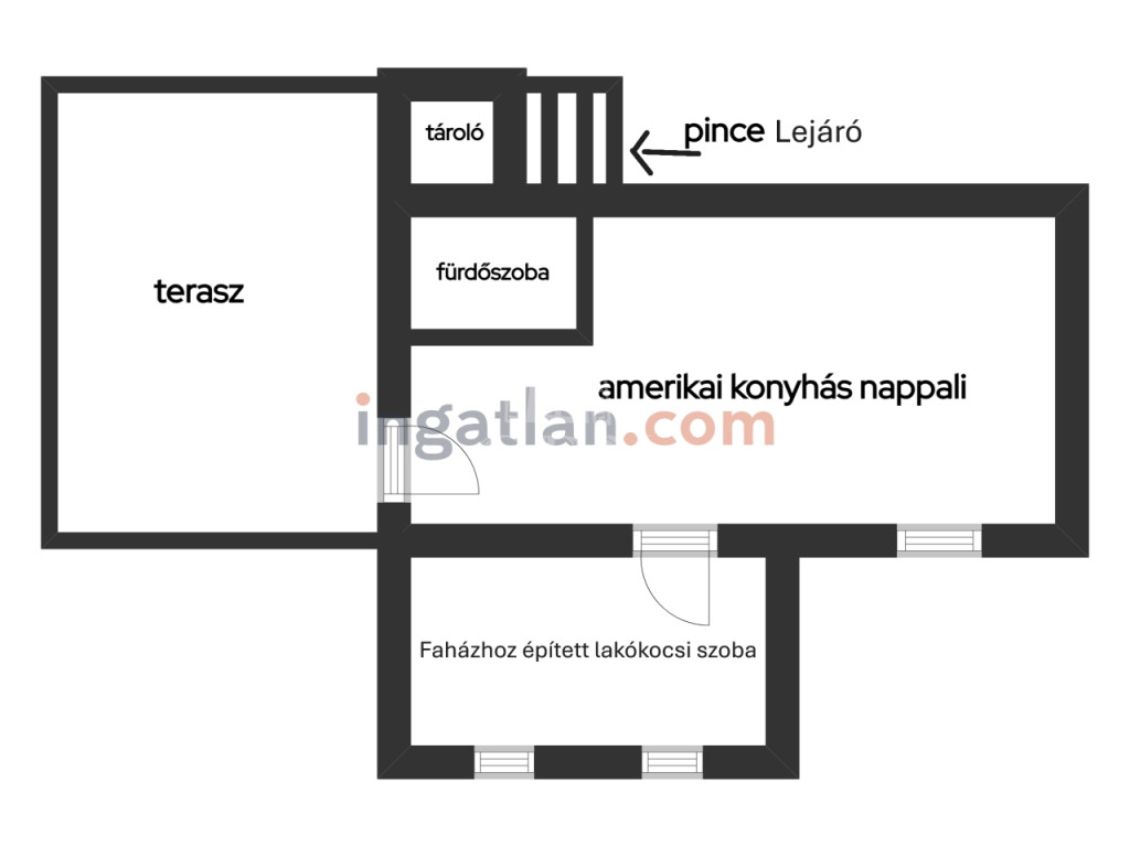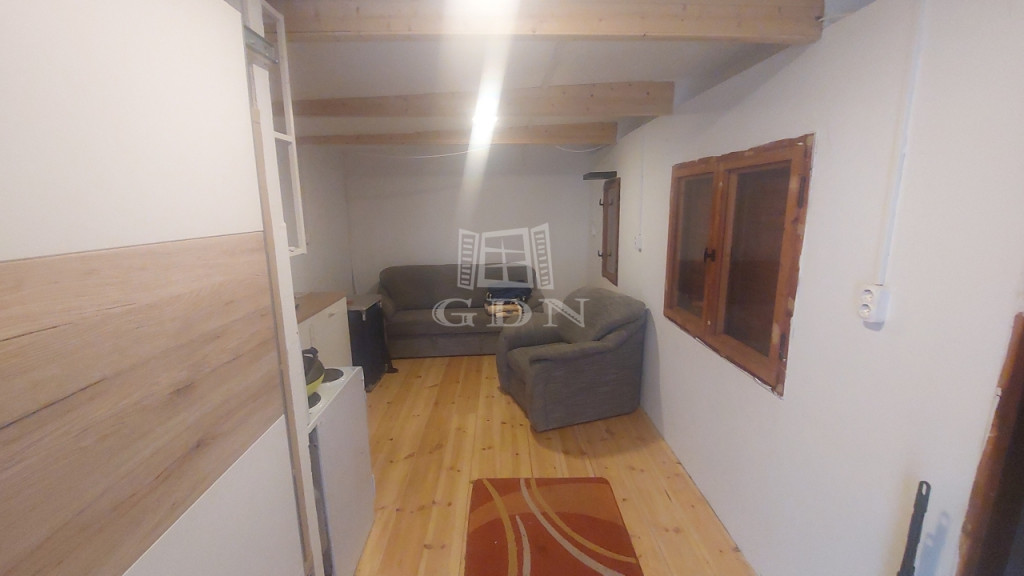 Egy kis faházat, miben található egy zuhanyzós fürdőszoba toalettel és egy amerikai konyhás nappali. Jelenlegi tulajdonos igényesen kibővítette egy szobával, amit lakokocsival oldott meg.
