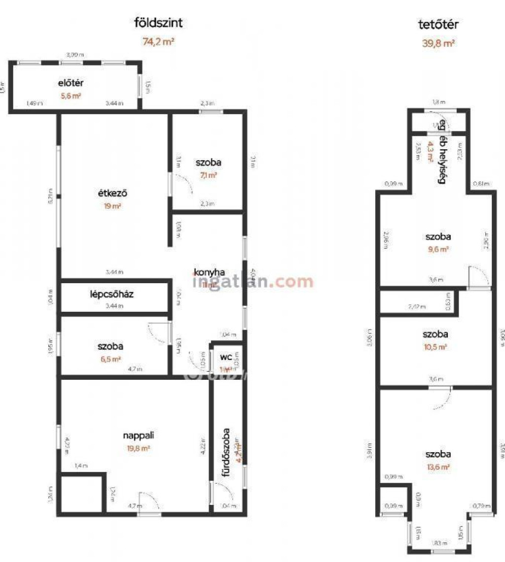A földszinten előszoba, étkező, konyha, három szoba, zuhanyzós fürdőszoba és külön WC található. Az emeletre két feljárón az étkezőből és az egyik szobából juthatunk fel, ahol további három szoba, külön WC és beépített gardróbszekrények kaptak helyet.