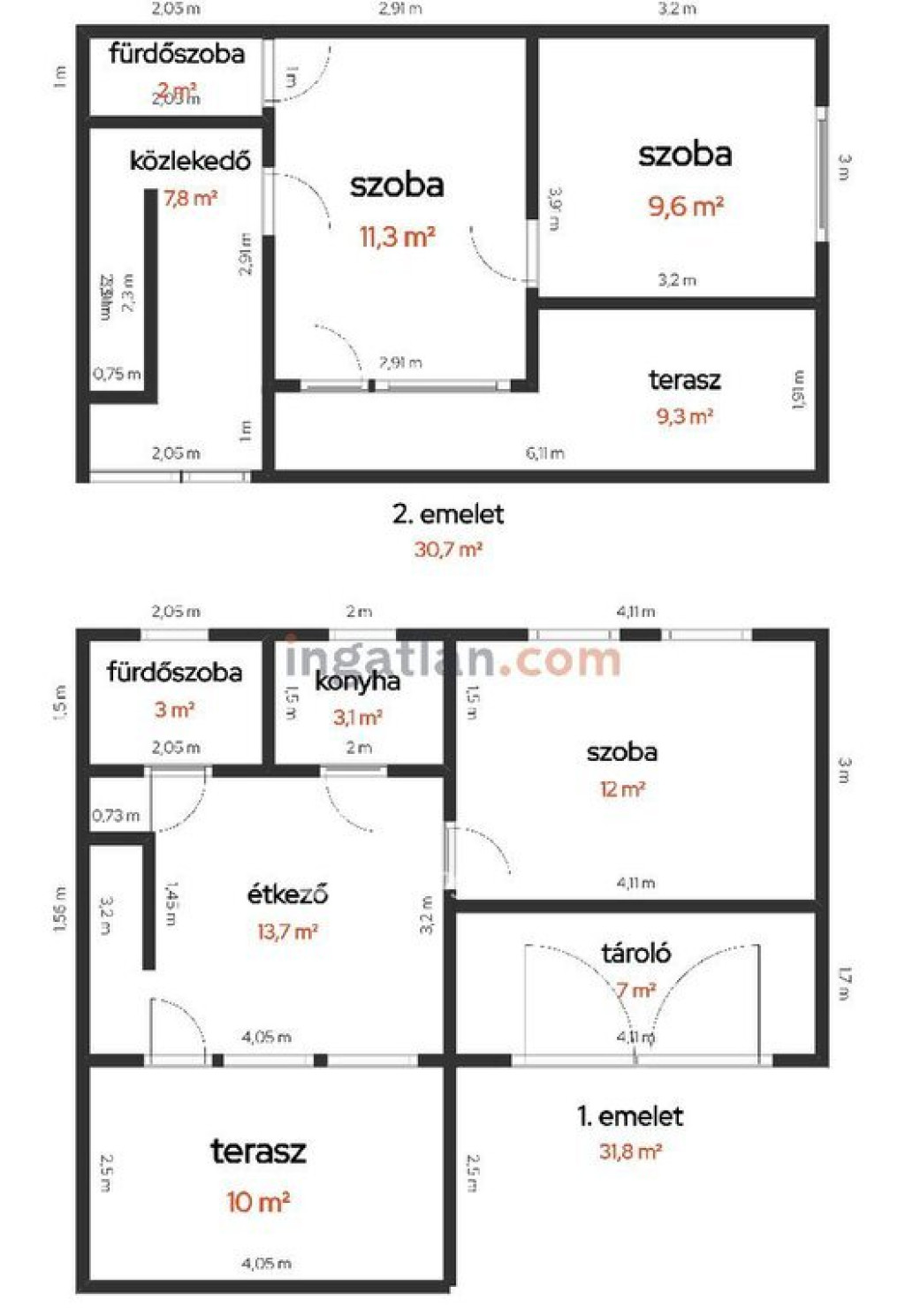 Az emeleti szinten két szoba, egy fürdőszoba, egy közlekedő és egy 9,3 nm-es terasz található.