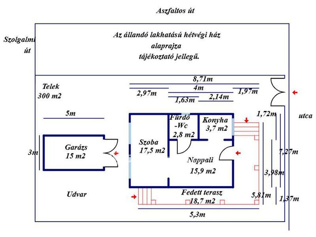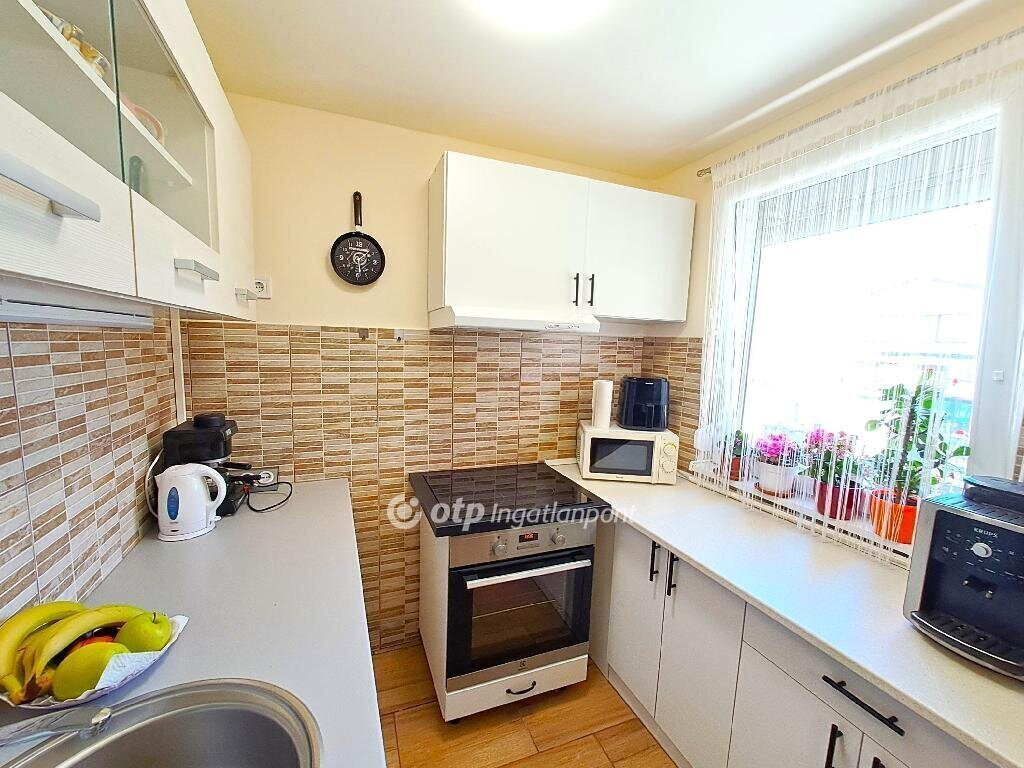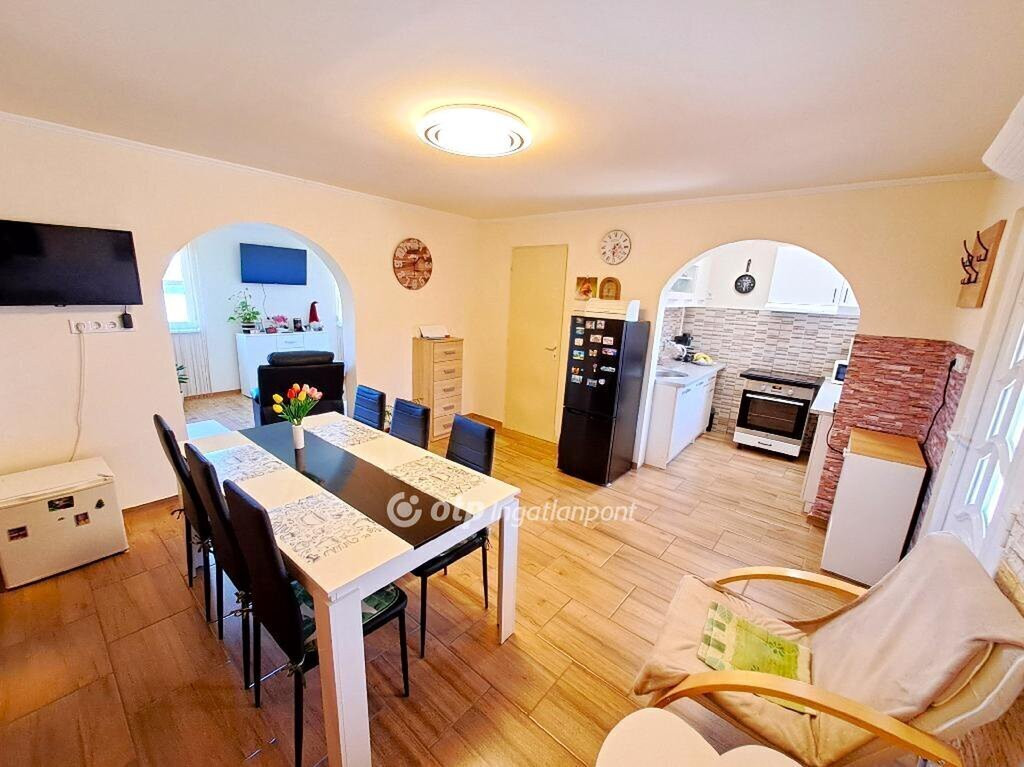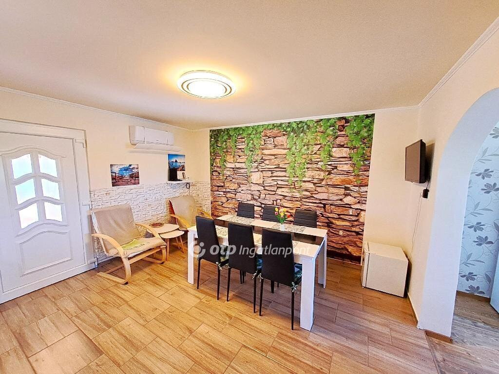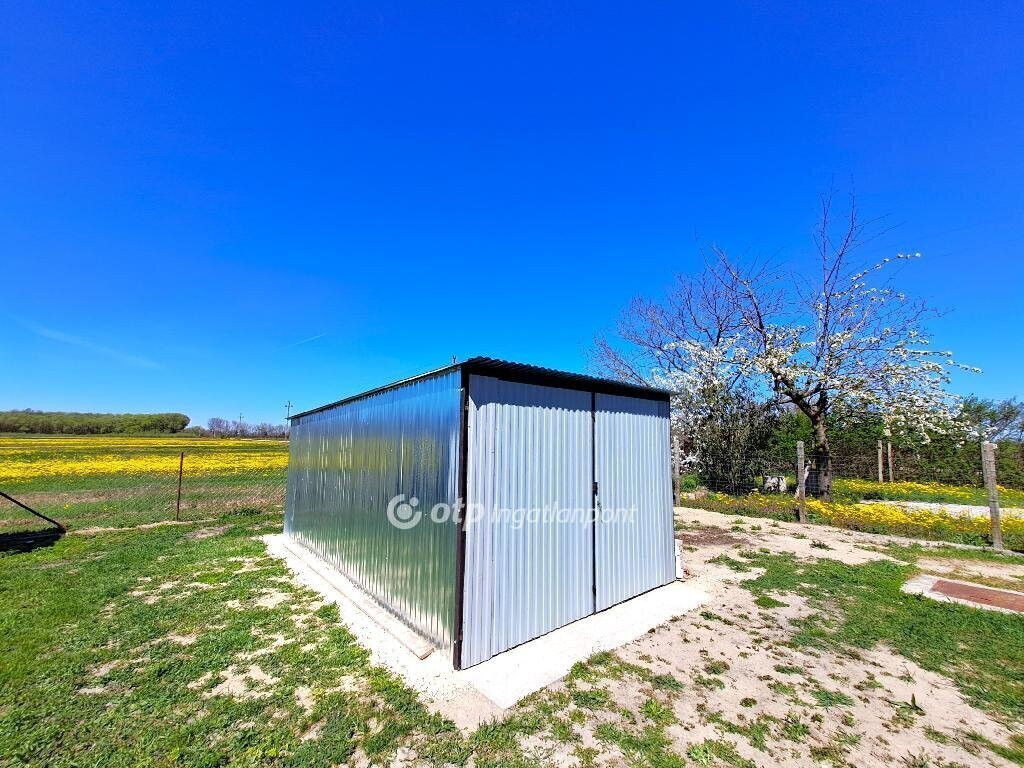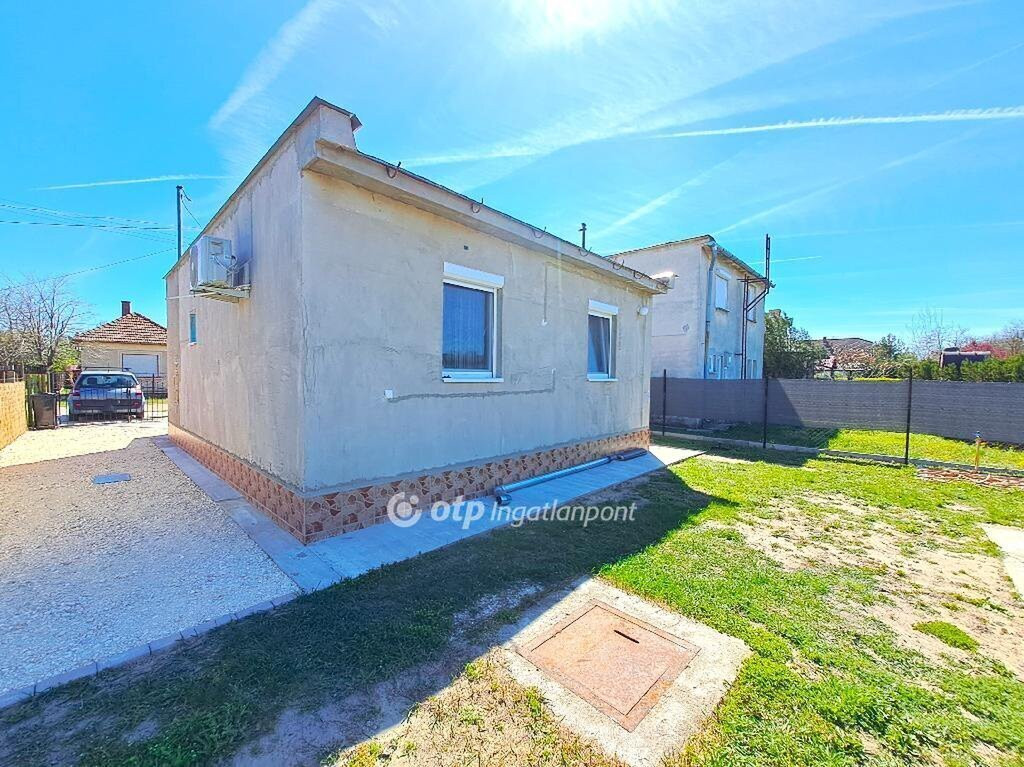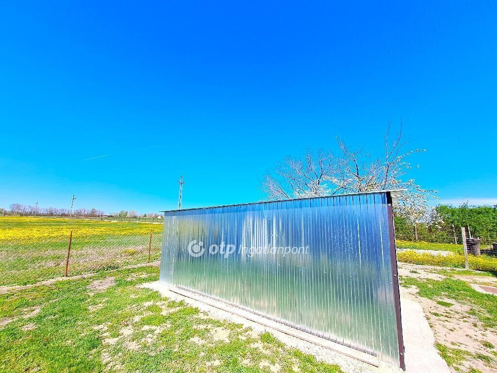 Bács-Kiskun vármegye, Tiszakécske-Kerekdombon, a Thermálfürdő közelében 39 m2 hasznos nettó alapterületű állandó lakhatásra kialakított hétvégi ház, 18 m2 nagyságú fedett terasszal és 15 m2 nagyságú garázzsal 300 m2-es telken eladó! Az 1980-ban épült ingatlan belterületi besorolású, jelenleg állandó lakhatásra kialakított. Az épület és udvara teljes felújításon esett át. A ház beton alapon tégla falazattal, beton födémen bitumenlemezzel és újraszigetelt lapostetővel készült. A homlokzat kőporozásra előkészített, körben 6 cm hőszigeteléssel ellátott. Az újonnan épített fa teraszfedés héjazata trapézlemez fedést és körben csatornát kapott, járólapos burkolása folyamatban van. A külső nyílászárók és a bejárati ajtó hőszigetelt műanyagra cseréltek, körben redőnnyel és szúnyoghálóval ellátottak. A belső terek elválasztására új műanyag borítású ajtó került beépítésre. A lakóépületben egy szoba, egy nappali, egy konyha, egy fürdőszoba-WC helyiség és egy 18 m2-es fedett terasz kapott helyet. Az ingatlanhoz tartozik még egy 15 m2 nagyságú szabvány lemezgarázs is. A lakóegység helyiségei laminált padló- és járólap burkolatot kaptak. A közművek közül a cserélt belső hálózatú egyfázisú 32 Amper villany-ellátás, valamint a H-tarifás plusz mérő, Fi-relével és körökre rendezett kismegszakítóval, a vezetékes víz-ellátás, valamint az emésztő rendelkezésre állnak. Az otthon melegéről két 3,5 KWh-teljesítményű hűtő-fűtő klíma, a fürdőszobában elektromos törölköző-szárító gondoskodik. Alternatív megoldásként egy vegyestüzelésű kémény is megépítésre került. A ház melegvíz ellátását egy 49 literes villanybojler adja. Az épület keresztben átszellőztethető. Az ingatlan belső bútorzattal és a komplett konyhai berendezéssel együtt eladó. Az udvar igényesen parkosított, térkövezett, murvázott és füvesített, körben bekerített. Gépjárművek behajtására kapubejáró, a védelem szempontjából kamera-rendszer biztosított. Az udvar hátsó részében álló garázs igény szerint elforgatható vagy a telek végében lévő szolgalmi út felőli kapu létesítésével megközelíthetővé válhat. Aszfaltozott út 20 méterre, a tömegközlekedés a főút mentén elérhető, autópálya felhajtó 2-3 km.