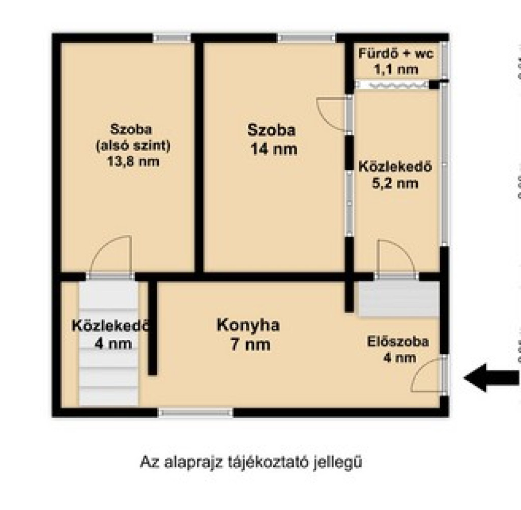 a bejárati ajtón belépve az előtérből balra nyílik a gépesített konyha, innen egy lépcsőn jutunk le az egyik lakószobába. Az előtérből jobbra elindulva egy közlekedő helyiségbe érkezünk, innen nyílik a fürdőszoba, illetve még egy lakószoba. Az épület valamennyi helyisége BELSŐ LÉPCSŐN megközelíthető!