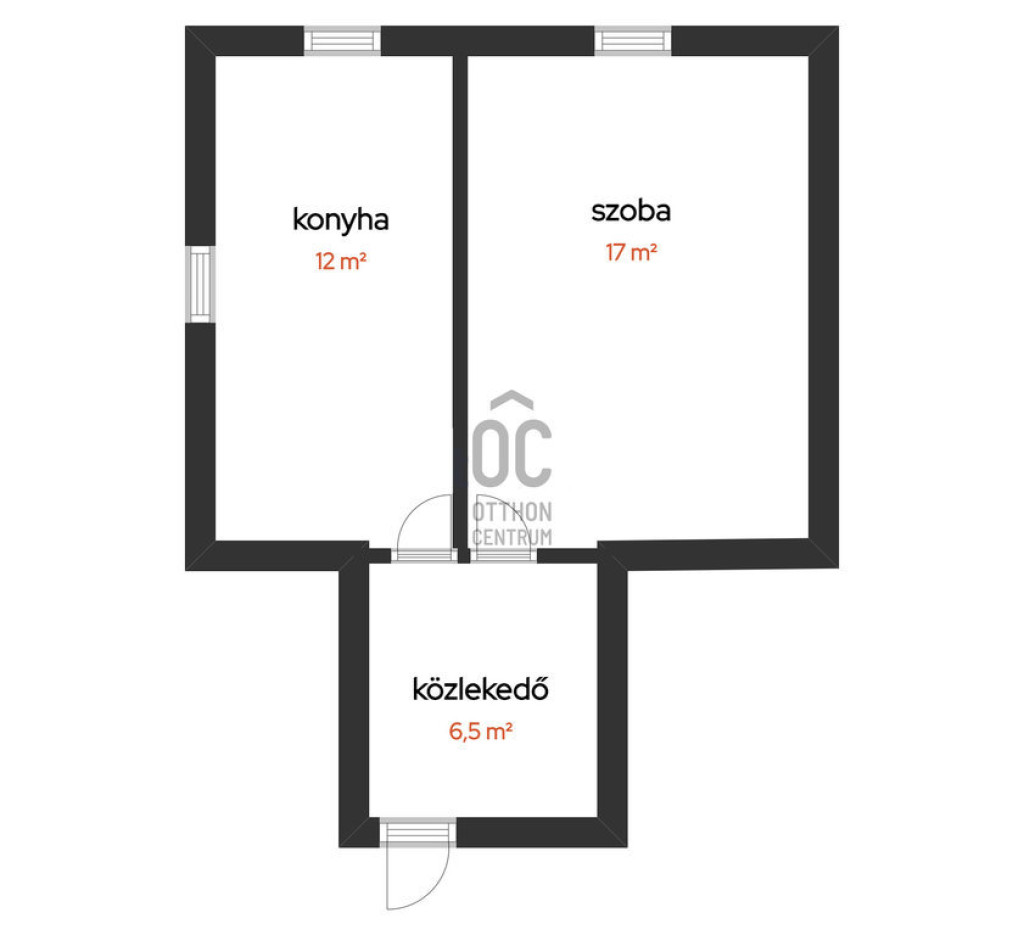 A fedett teraszon keresztül juthatunk a földszinti lakrészbe, ahol az előtérből két szoba, konyha étkezővel és fürdőszoba WC-vel található.