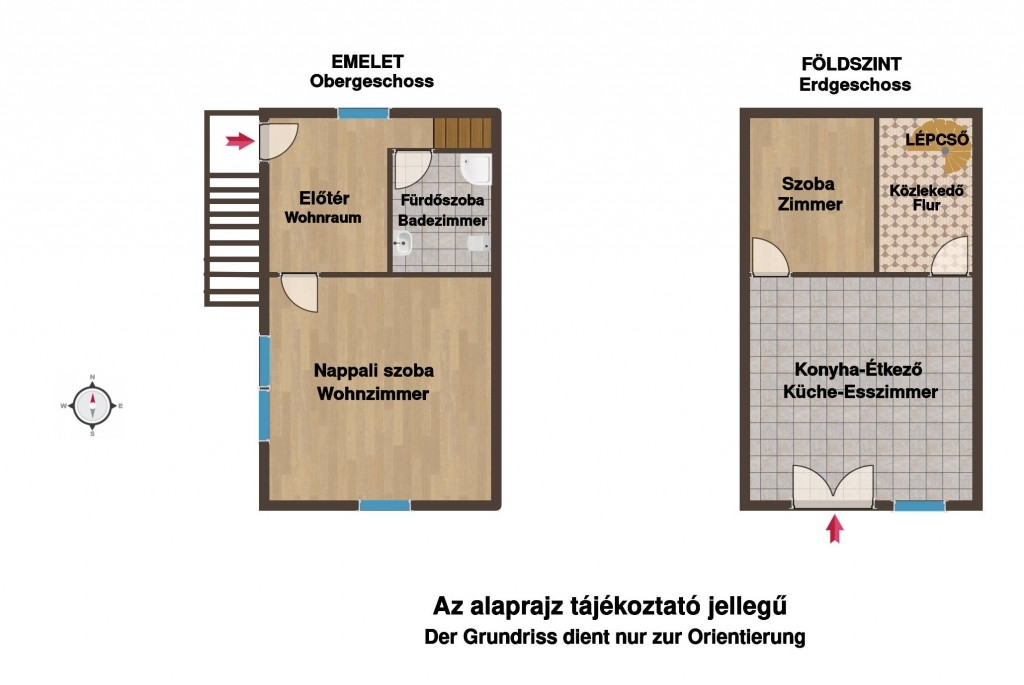 A ház alsó szintjén egy tágas étkezőkonyha található, amely kiválóan alkalmas családi vagy baráti összejövetelekhez. Ezen a szinten helyet kapott egy kényelmes szoba, valamint egy külön helyiség, amelyből egy belső lépcső vezet az emeletre. A felső szintre érkezve egy világos, tágas előtér vagy szoba fogad, amely többféle funkcióra is alkalmas lehet dolgozószobának, olvasósaroknak vagy vendégszobának is kiváló.