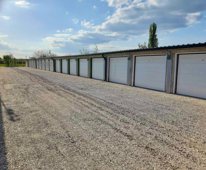 Zárt, privát garázssor, két irányból, távirányítós, elektromos úszókapun keresztül lehet megközelíteni.