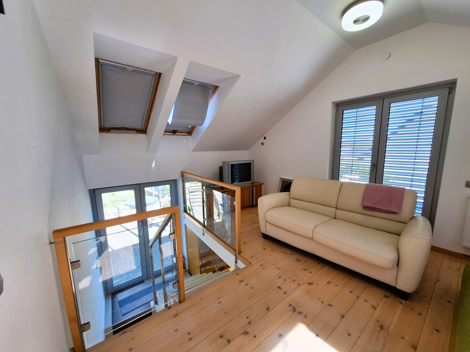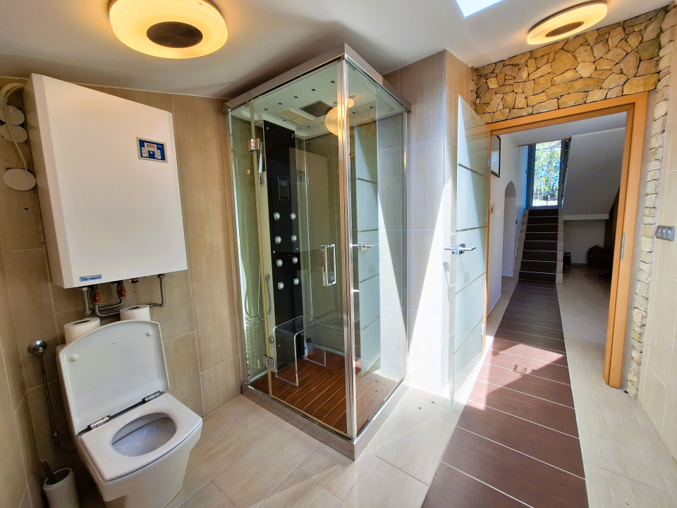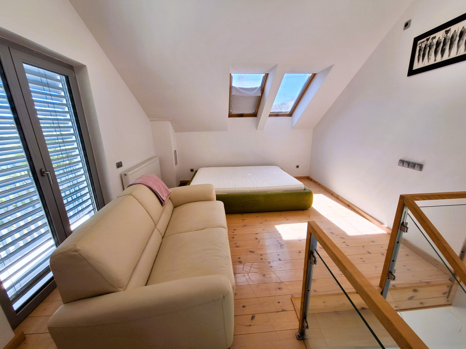 Az alsó szinten konyha, fürdőszoba és egy borospince, míg az emeleti részen a hálószoba lett kialakítva.