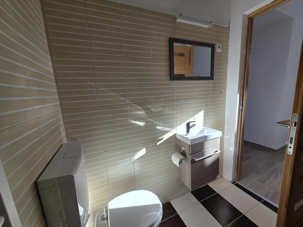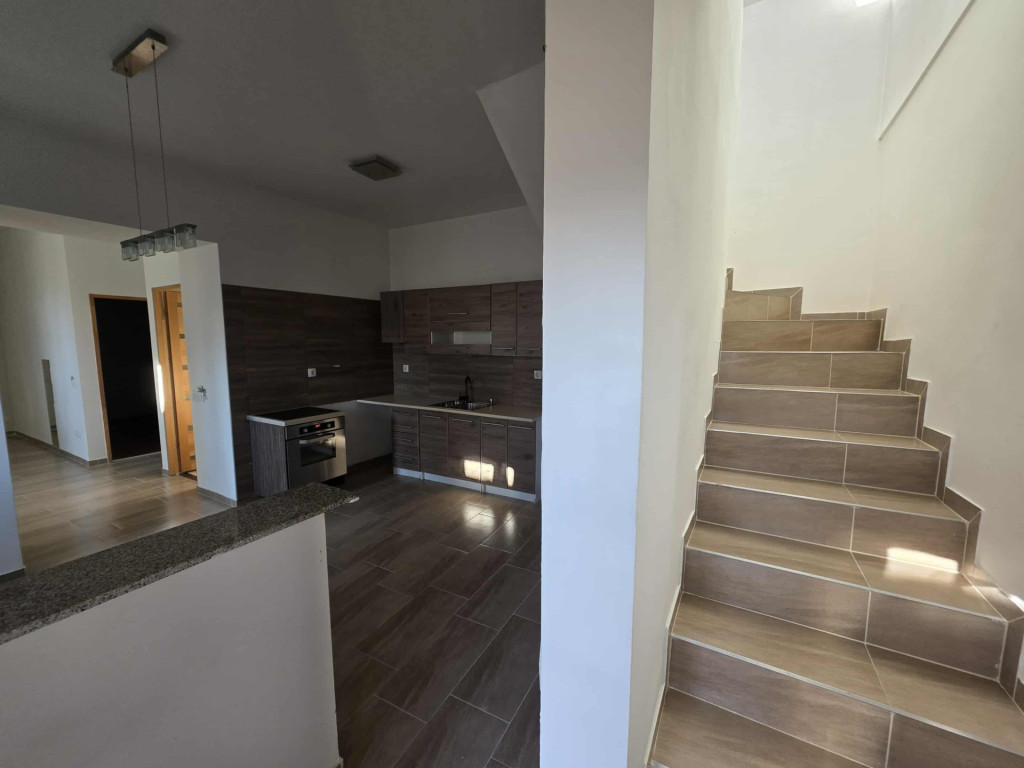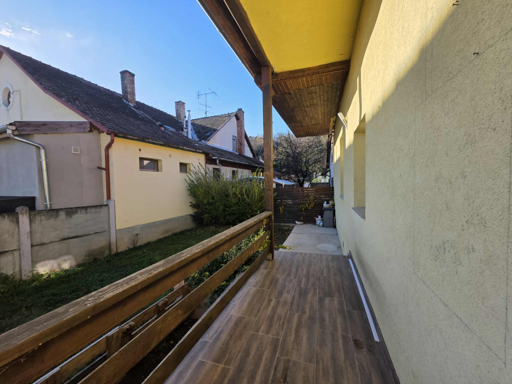Az alsó szinten a konyha, egy szoba és a tusolós fürdő, a felső szinten két szoba, kis előtér és a kádas fürdő kapott helyet. A terasz 10, a telek 150 négyzetméter.