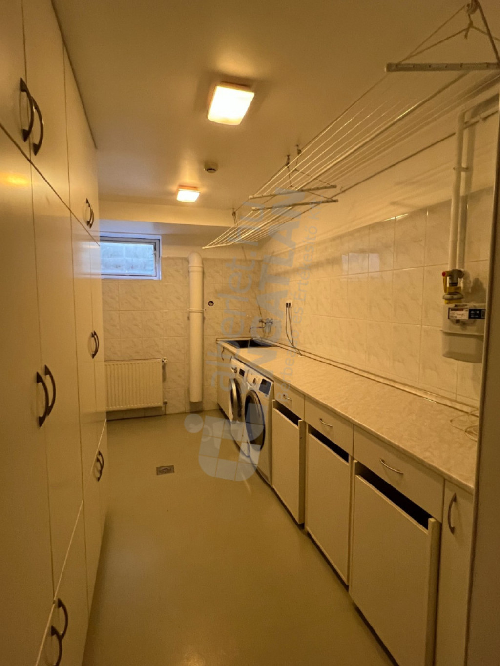 Mosókonyha beépített tárolókkal, mosógéppel és szárítógéppel