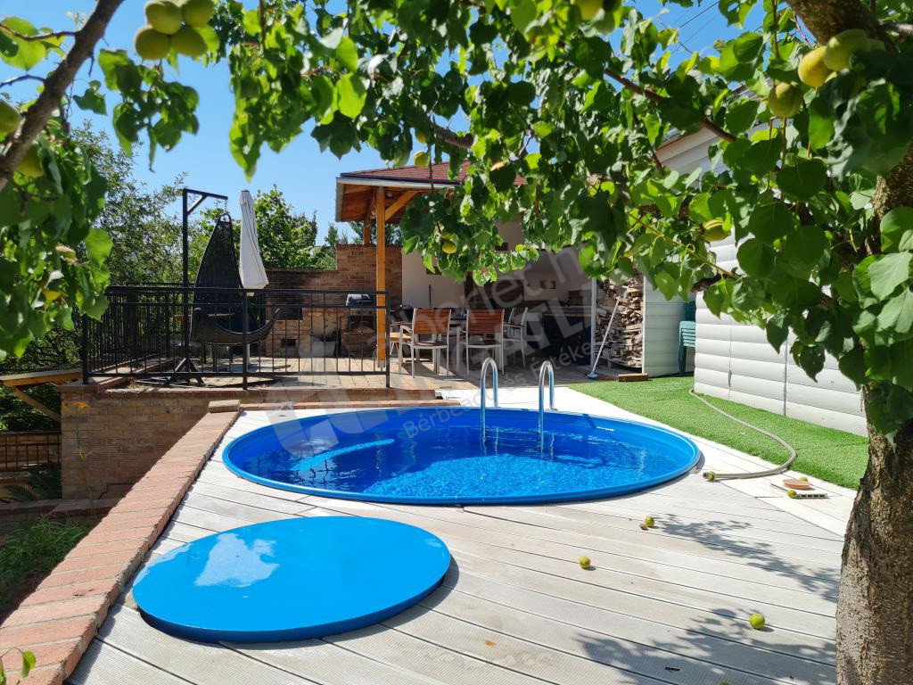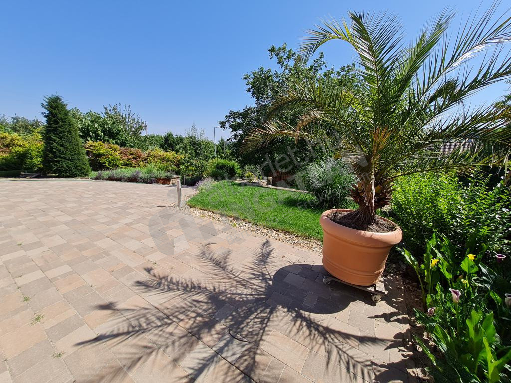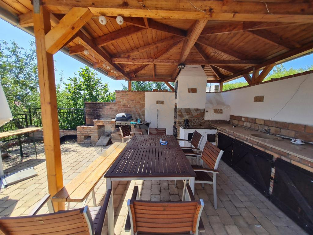 Rendezett díszkert, kerti zuhannyal, fedett nyári konyhával, sütőgetővel, kemencével.