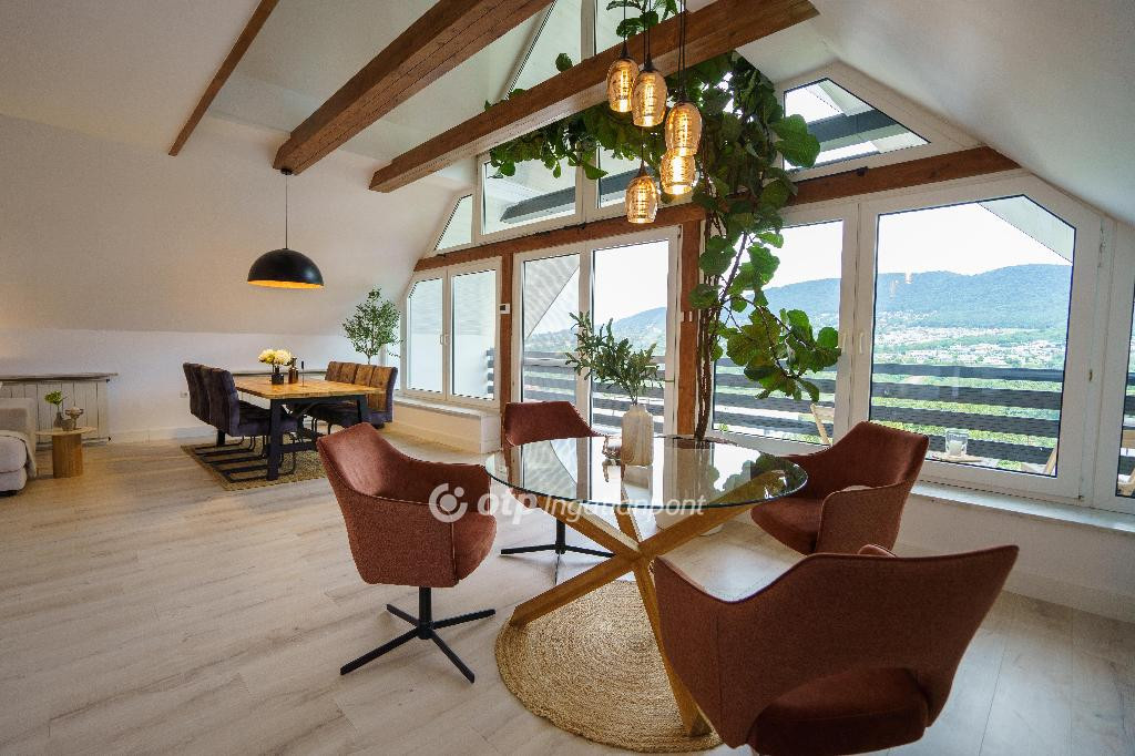 A separate, private apartment on the upper floor of a family house, featuring a generous open-plan living space and pleasant open views. The living room, dining area and kitchen form one continuous space, with large windows that bring in natural light and create an airy, relaxed atmosphere.