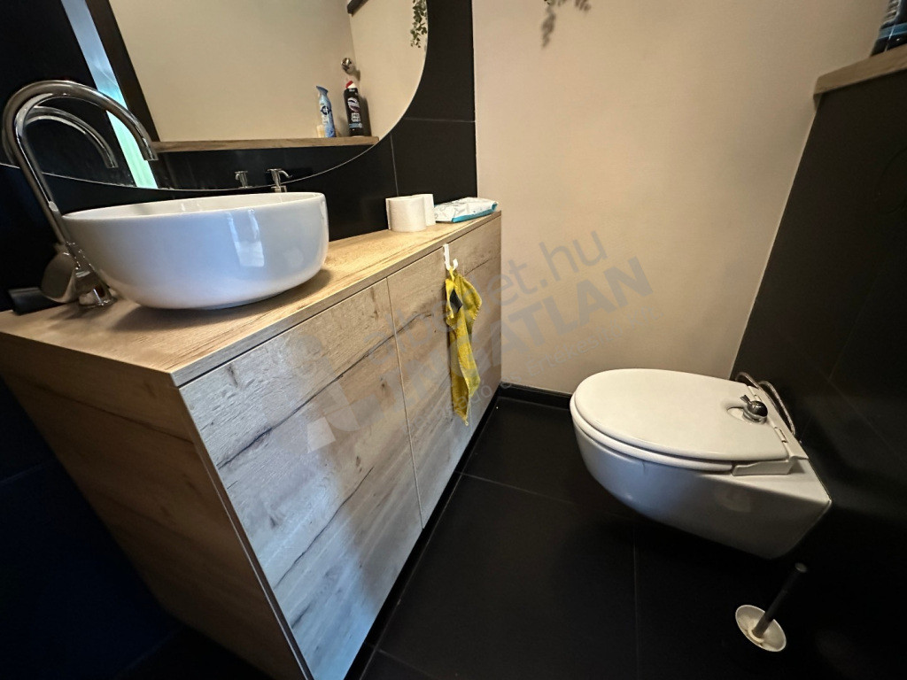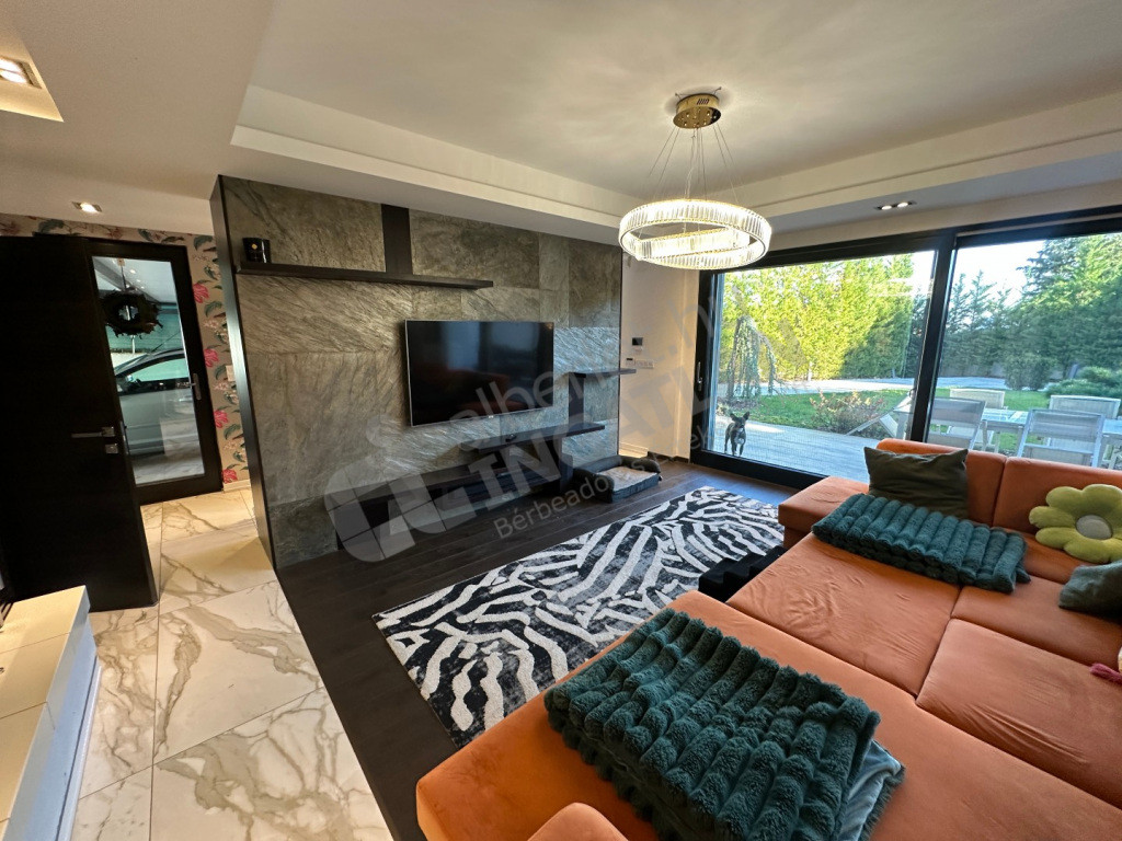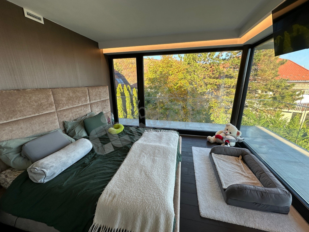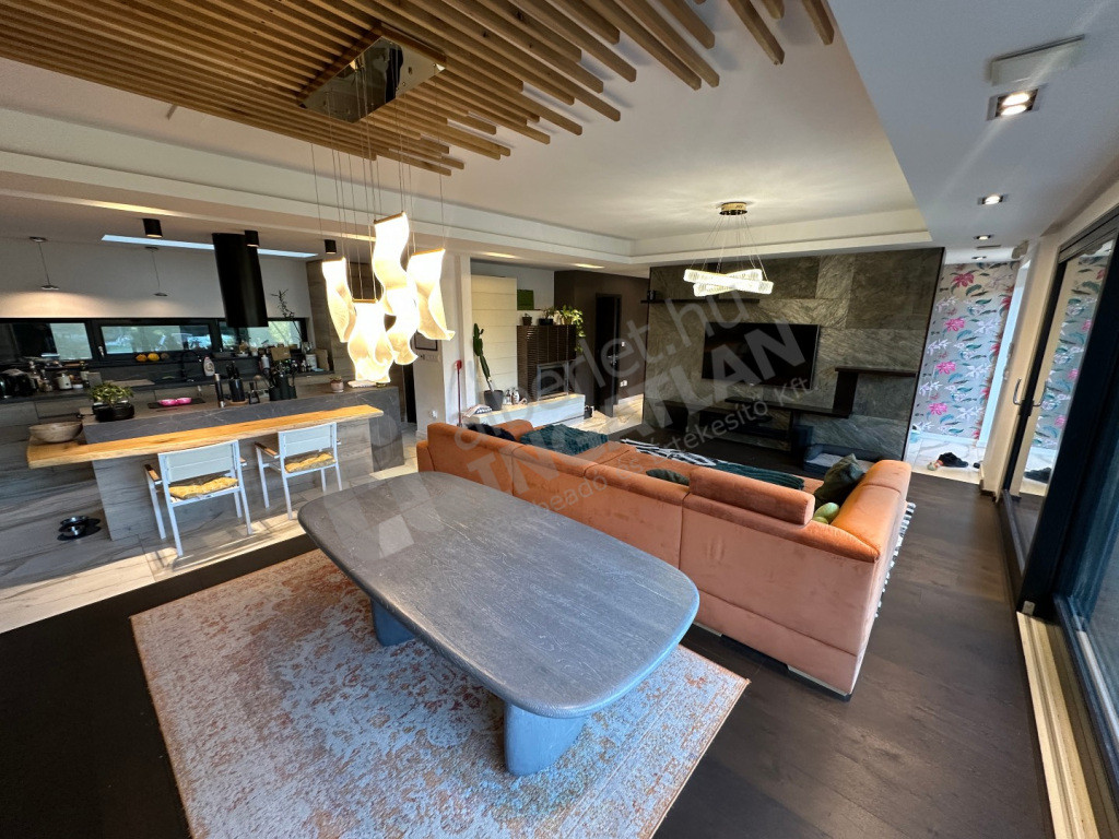Négy hálószoba, tágas nappali-konyha, két fürdőszoba, két külön WC, óriási panorámás tetőterasz, fedett, két állásos autóbeálló, tárolóhelyiségek, szauna, díszkert.