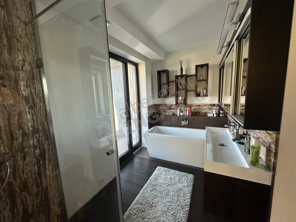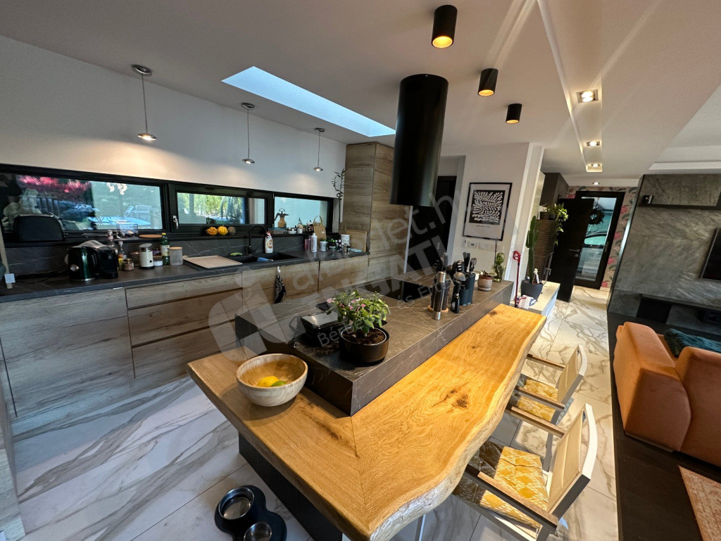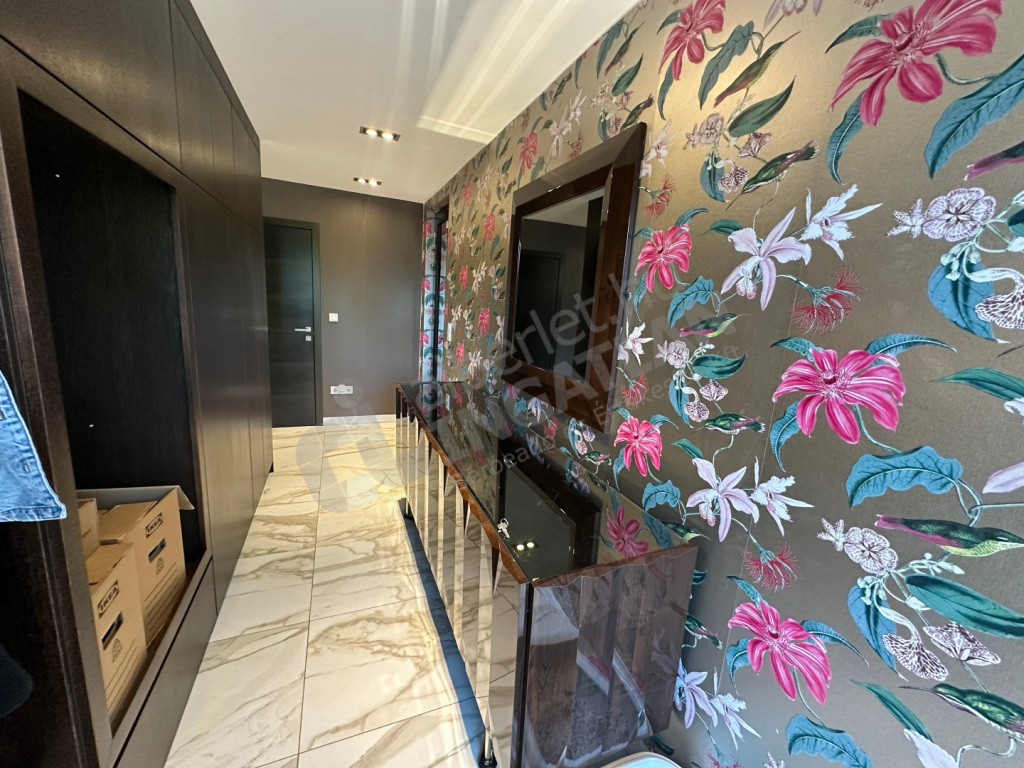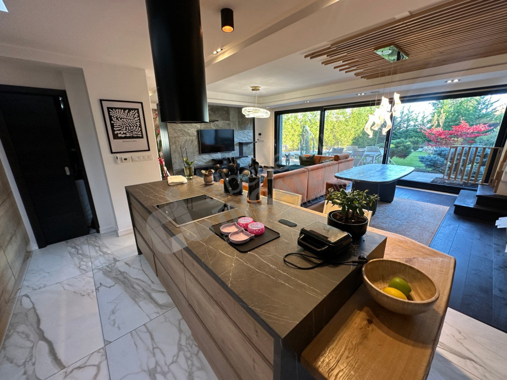 Négy hálószoba, tágas nappali-konyha, két fürdőszoba, két külön WC, óriási panorámás tetőterasz, fedett, két állásos autóbeálló, tárolóhelyiségek, szauna, díszkert.