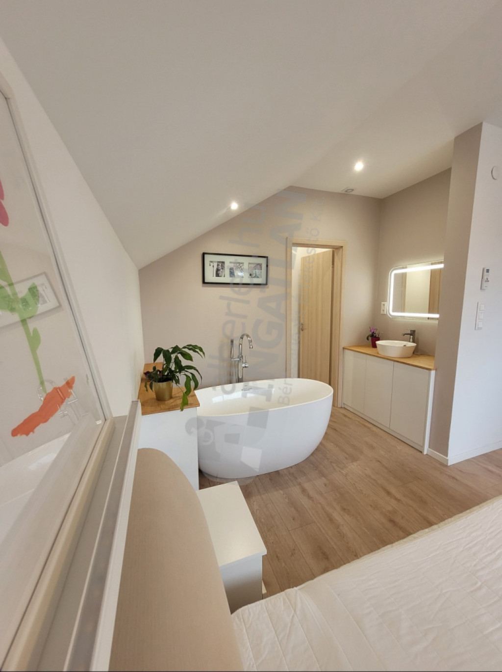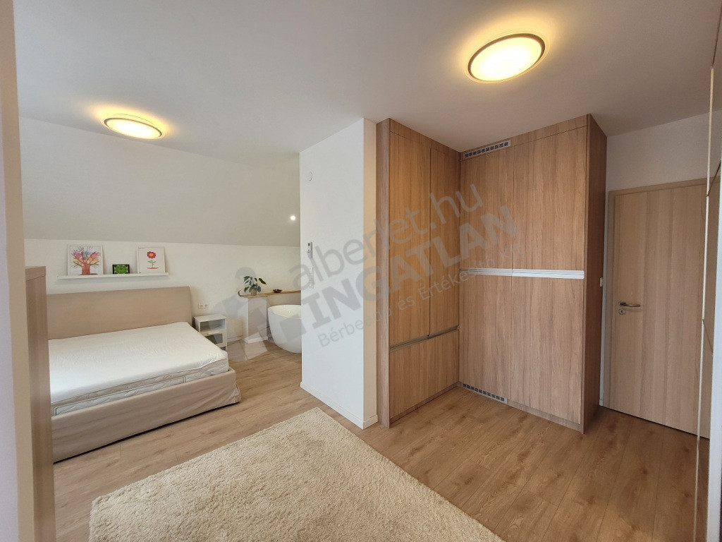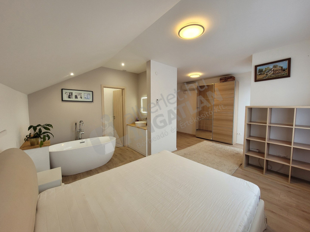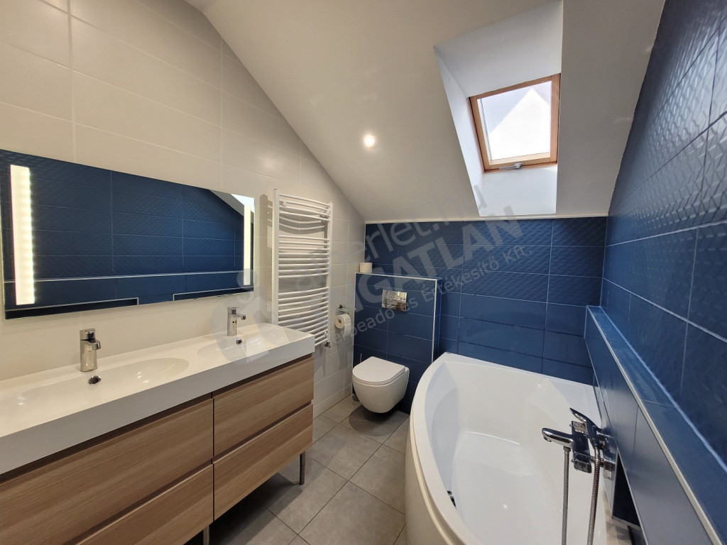 A ház emeleti szintjén 6 hálószoba került kialakításra. Egy közös kádas fürdőszoba wc-vel és dupla csapos mosdószekrénnyel. A szülői hálóban wellis szabadonálló kád saját mosdóval és wc-vel, valamint beépített gardróbszekrénnyel. A kád miatt a szülői háló speciális spc-vel burkolt.