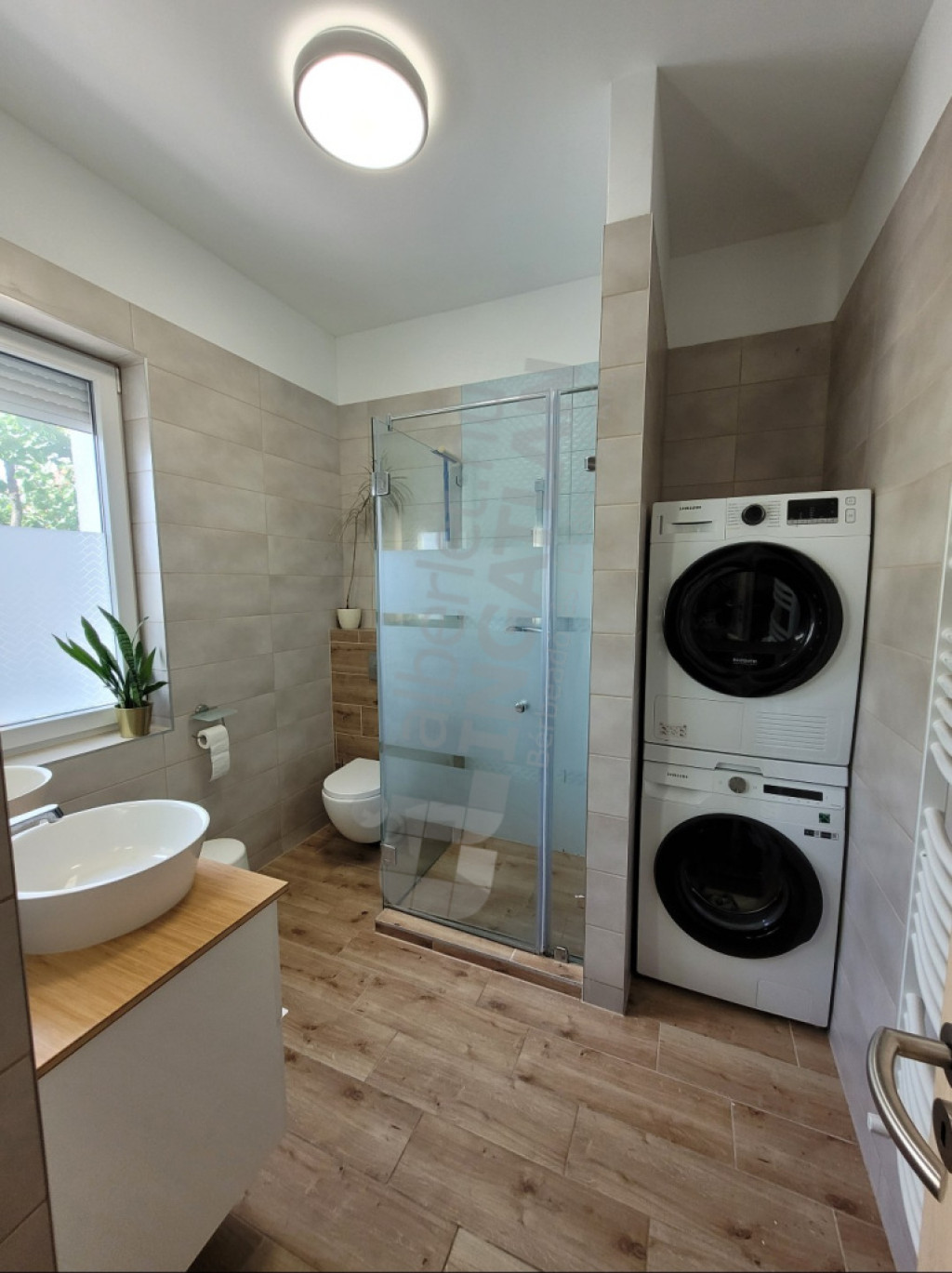 A ház földszintjén az előszobából nyílik egy vendégmosdó, egy zuhanyzós fürdőszoba wc-vel, itt kapott helyet a mosó és szárítógép is. Az előszobában beépített cipősszekrény és előszobafal található.