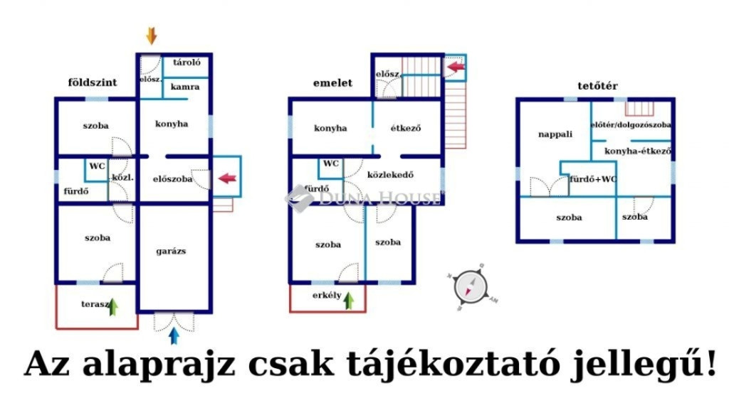 - Tetőtér (az emeleti előszobából lehet felmenni): Nappali, Szoba, Félszoba, Konyha, Fürdőszoba Wc-vel, Közlekedő