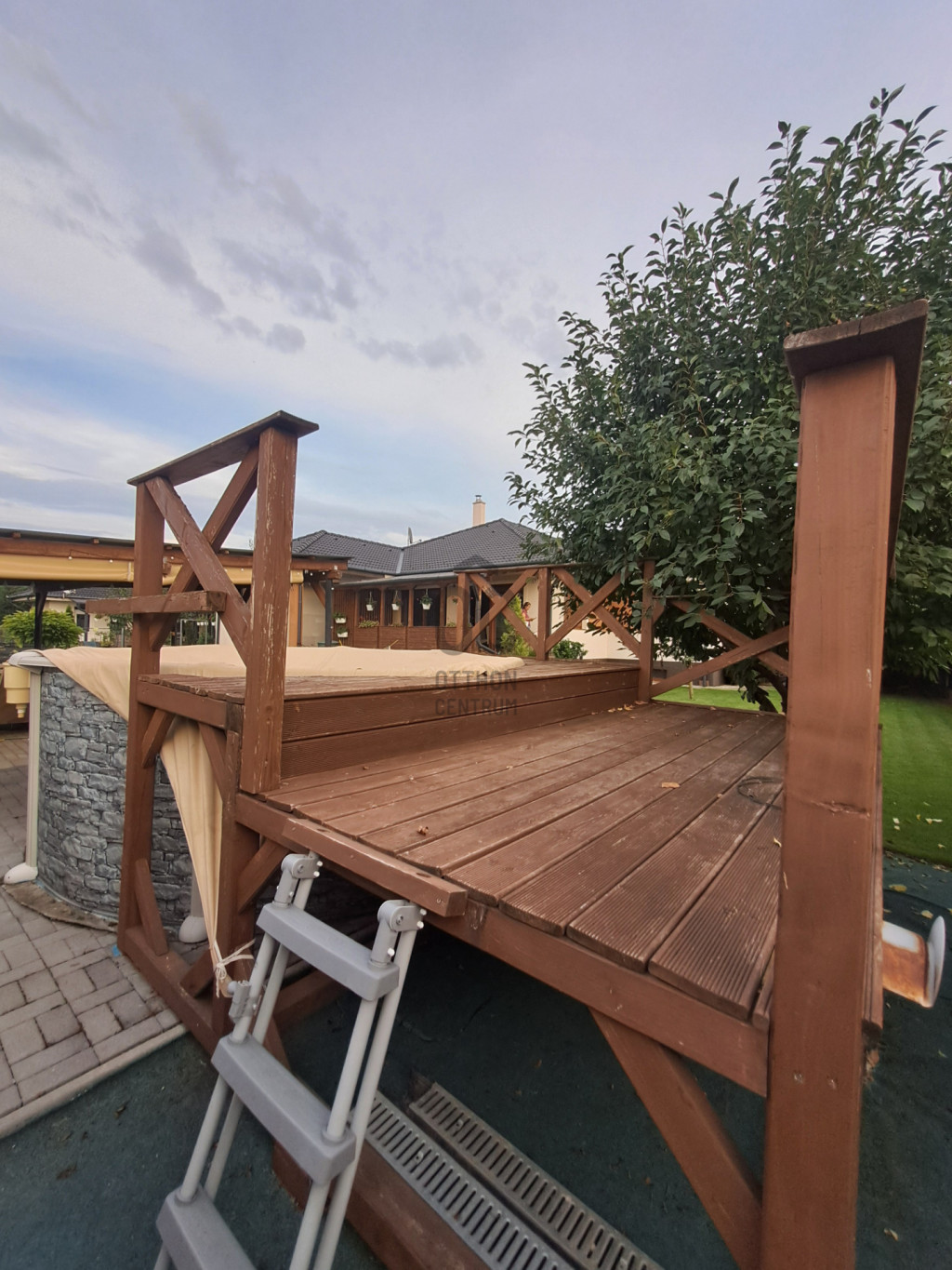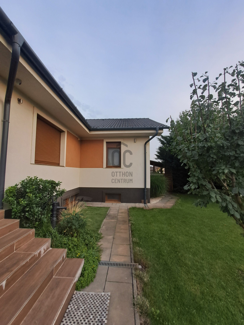 430 m² teljesen parkosított kert automata öntözőrendszerrel , örökzöldekkel, filagóriával, magas ágyással, ellenáramoltatós, hőgenerátoros 3,5 méter átmérőjű, medencével,