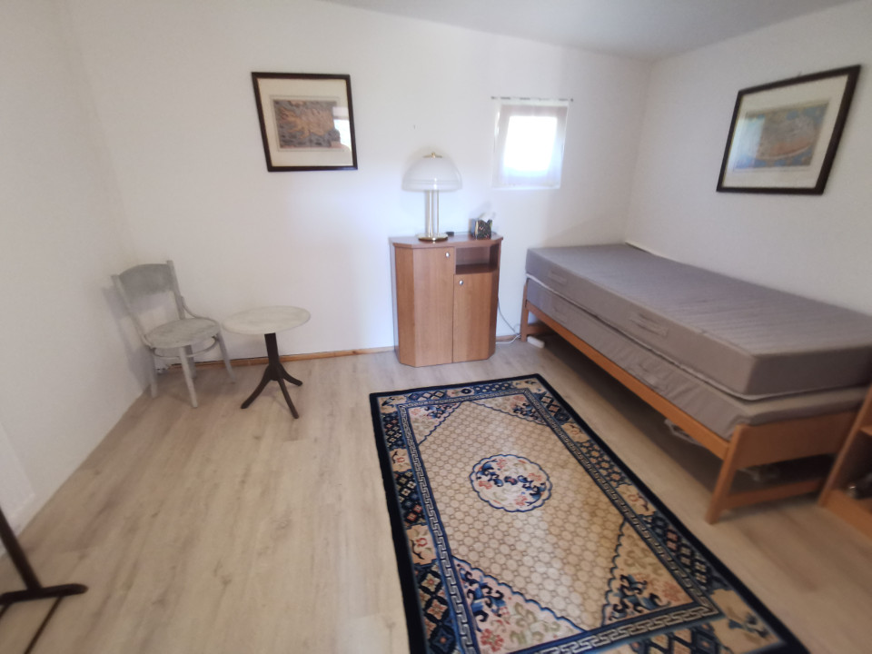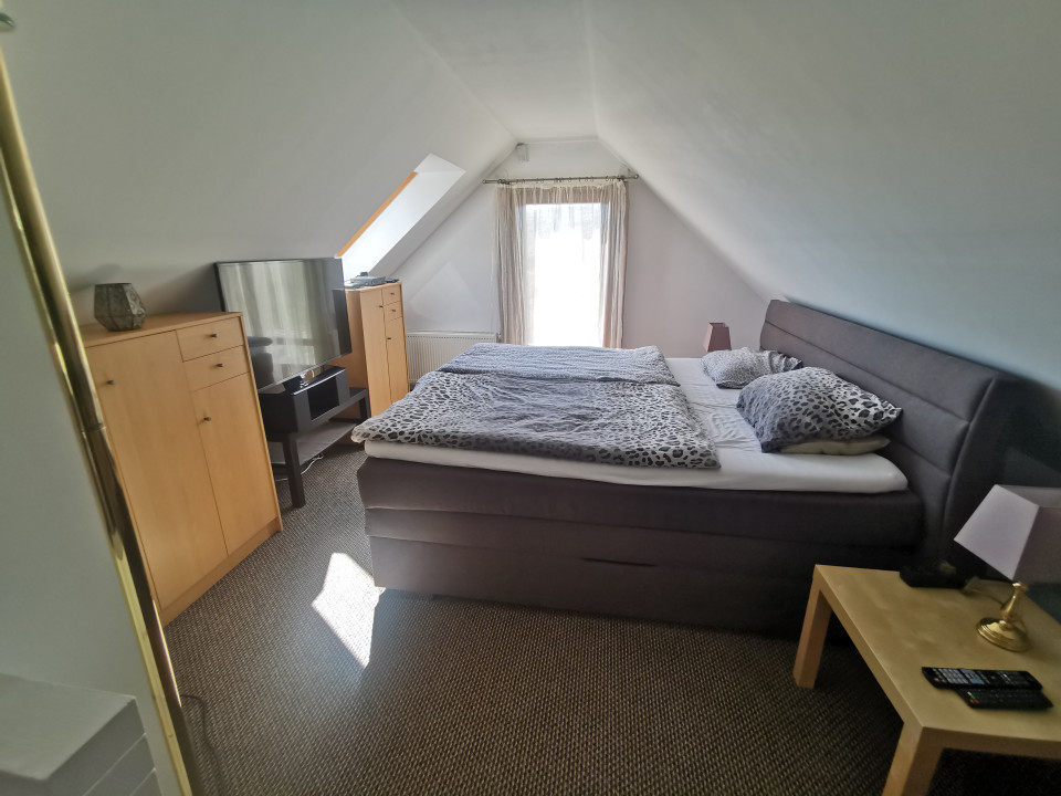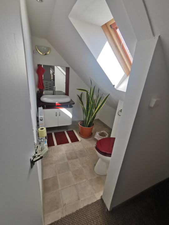 Az emeleten található egy hálószoba, gardrobre és egy WC kézmosóval.