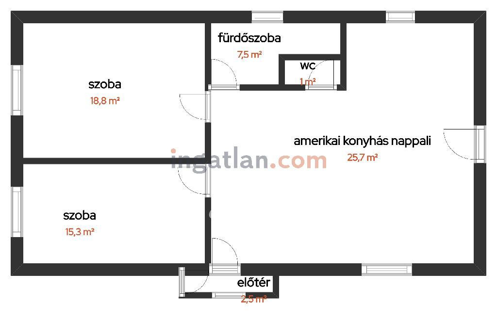Helyiségek: földszint: előszoba, amerikai konyhás nappali, 2 szoba, fürdőszoba, külön WC, 73 m2 terasz; tetőtér: 2 db erkély, 3 szoba, konyha étkező egyben, folyosó, fürdőszoba, külön WC.