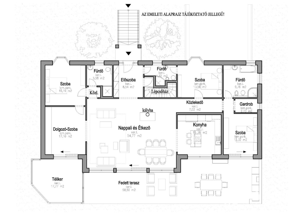 - Emelet: ~170,30 m2 + ~18,00 Télikert + ~58,50 m2 Fedett terasz