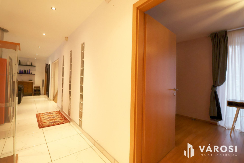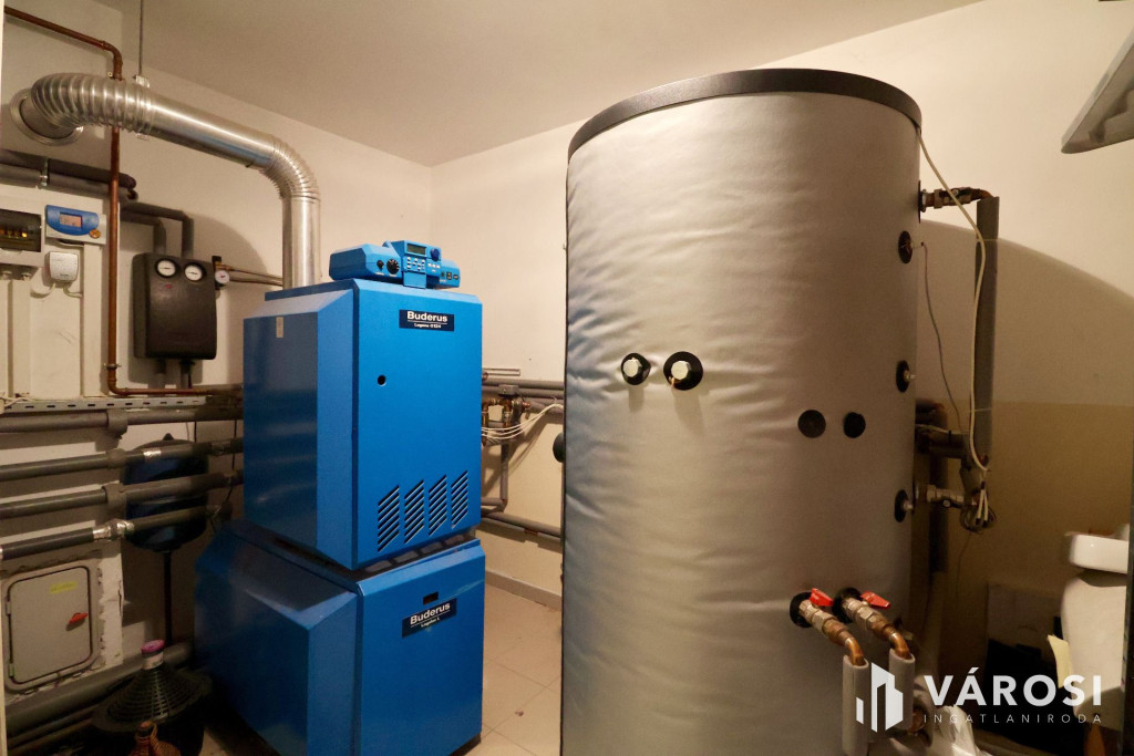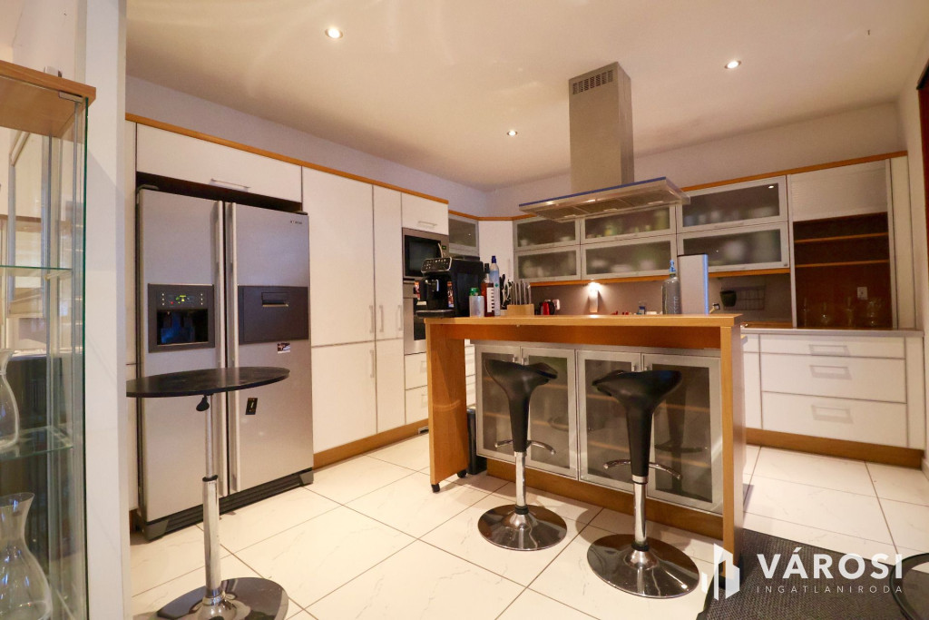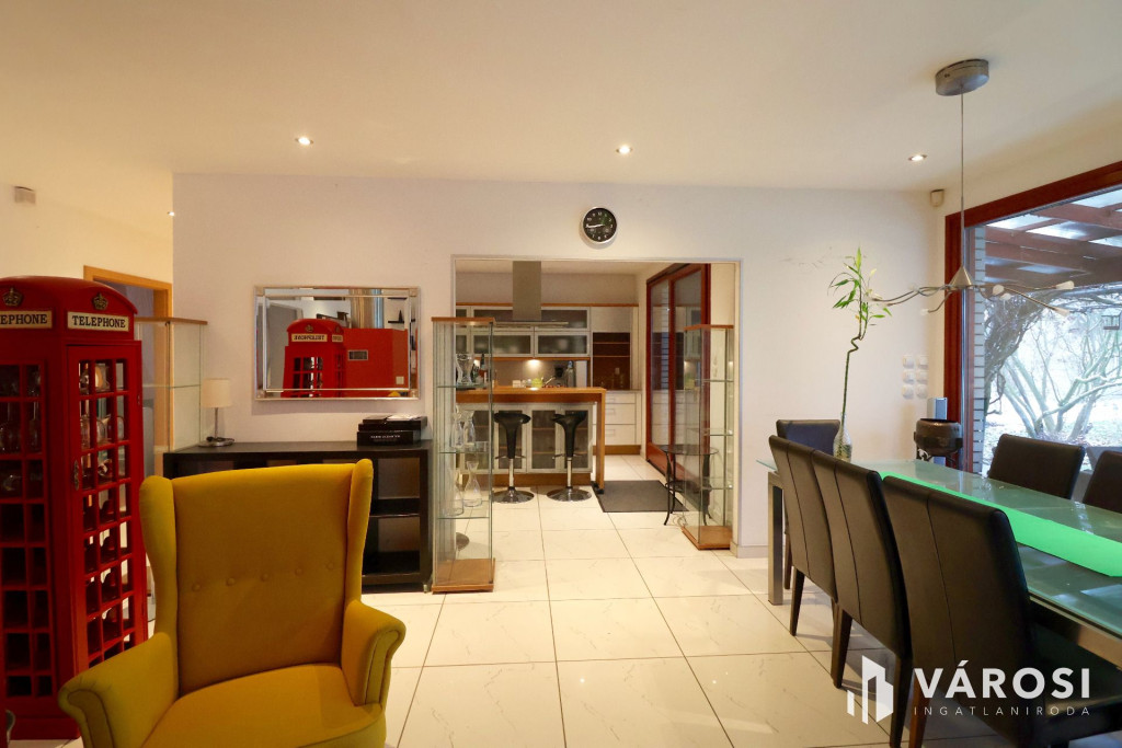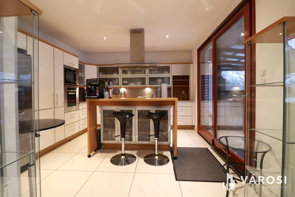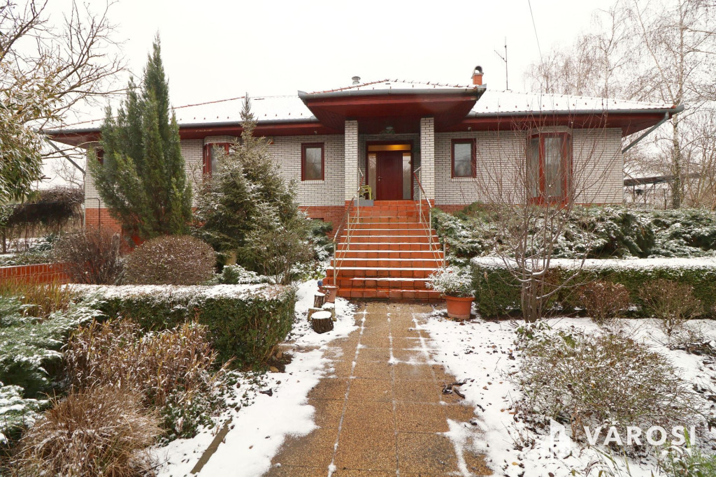 Tágas Nappali és Étkező helyiségben helyett kapott egy látvány-kandalló, innen nyílik a beépített teljesen felszerelt Konyha és a Dolgozó-szoba. Ezen a szinten lévő három hálószobához saját fürdőszoba tartozik. A Téli-kert a Dolgozó-szobából és a teraszról is megközelíthető. Az ~58,00 m2 fedett, burkolt terasz - kültéri sütögetővel - növeli a lakótér kihasználhatóságát. A kétállásos garázs ~ 44,00 m2. Központi fűtést egy Buderus Logano G 124 kazán -csökkentett káros-anyag kibocsátású, teljesen automatikus üzemű -biztosítja.