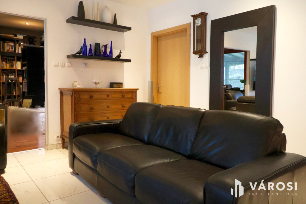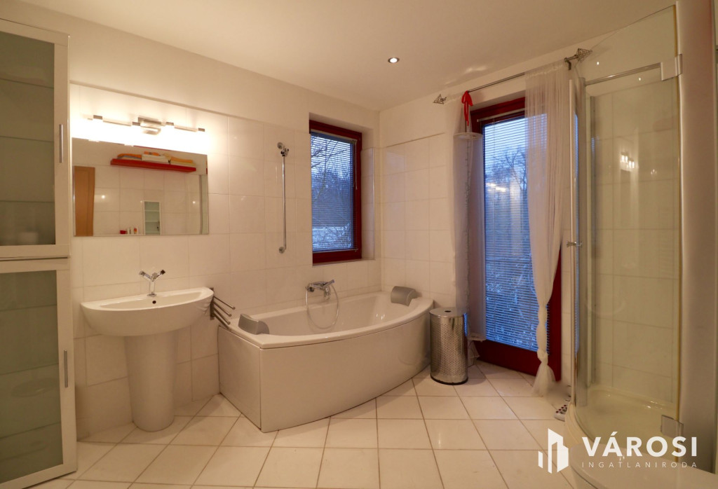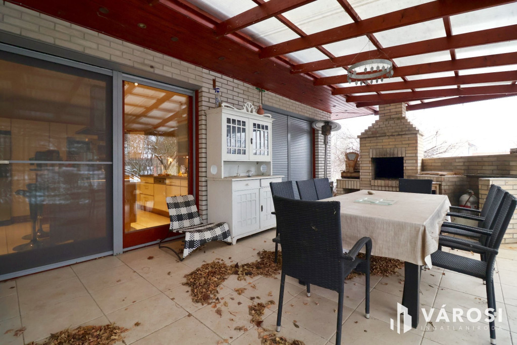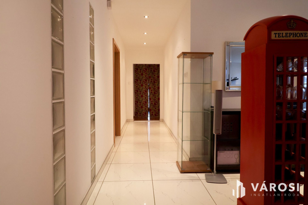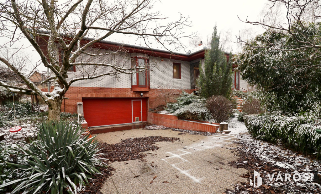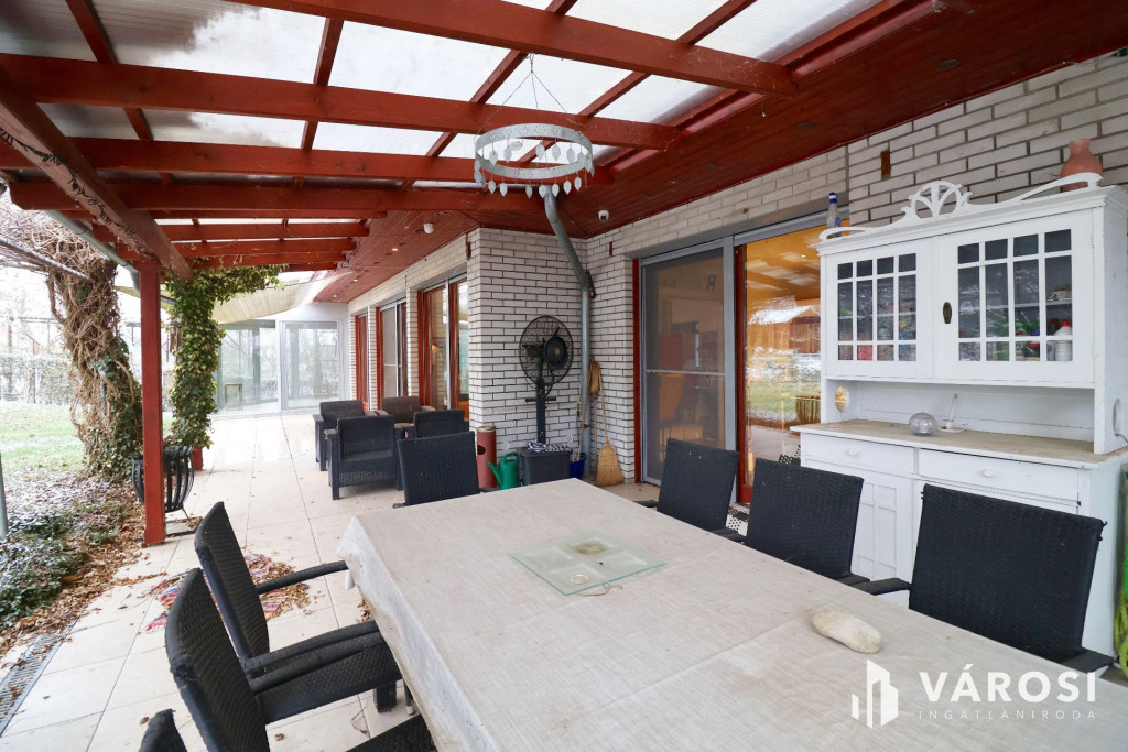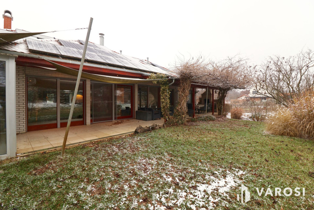 Tágas Nappali és Étkező helyiségben helyett kapott egy látvány-kandalló, innen nyílik a beépített teljesen felszerelt Konyha és a Dolgozó-szoba. Ezen a szinten lévő három hálószobához saját fürdőszoba tartozik. A Téli-kert a Dolgozó-szobából és a teraszról is megközelíthető. Az ~58,00 m2 fedett, burkolt terasz - kültéri sütögetővel - növeli a lakótér kihasználhatóságát. A kétállásos garázs ~ 44,00 m2. Központi fűtést egy Buderus Logano G 124 kazán -csökkentett káros-anyag kibocsátású, teljesen automatikus üzemű -biztosítja.