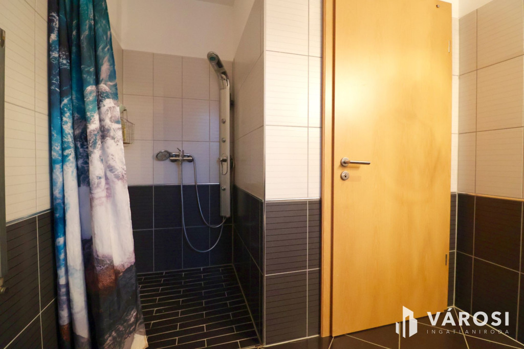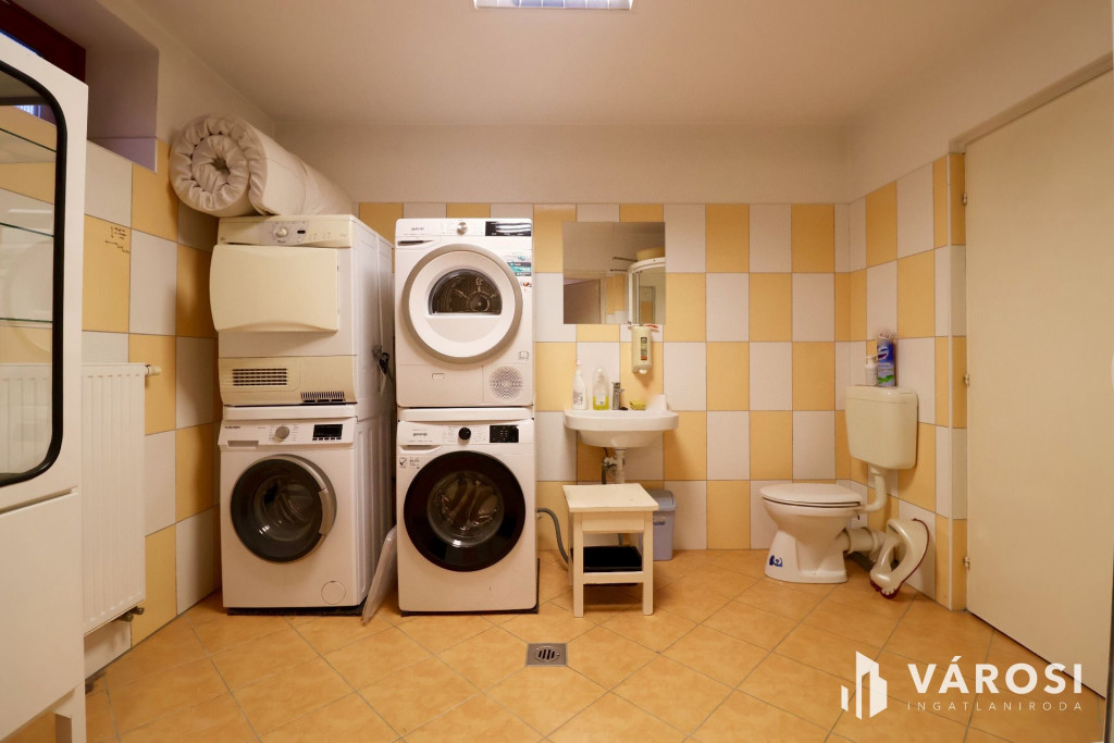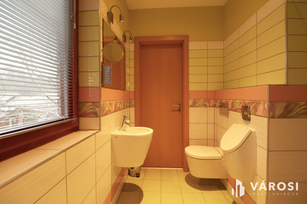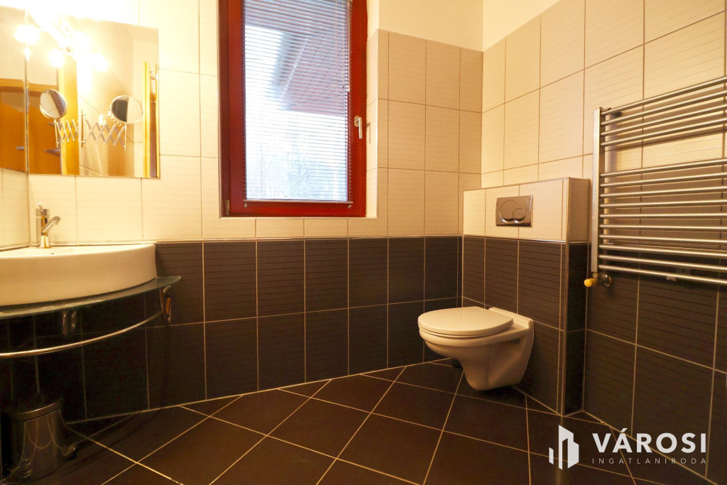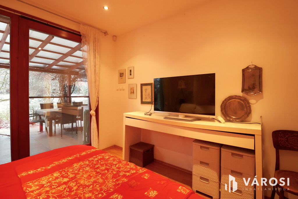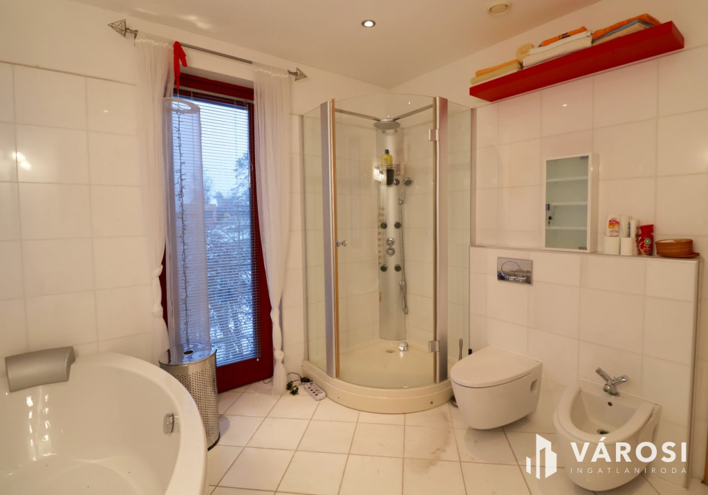 Tágas Nappali és Étkező helyiségben helyett kapott egy látvány-kandalló, innen nyílik a beépített teljesen felszerelt Konyha és a Dolgozó-szoba. Ezen a szinten lévő három hálószobához saját fürdőszoba tartozik. A Téli-kert a Dolgozó-szobából és a teraszról is megközelíthető. Az ~58,00 m2 fedett, burkolt terasz - kültéri sütögetővel - növeli a lakótér kihasználhatóságát. A kétállásos garázs ~ 44,00 m2. Központi fűtést egy Buderus Logano G 124 kazán -csökkentett káros-anyag kibocsátású, teljesen automatikus üzemű -biztosítja.