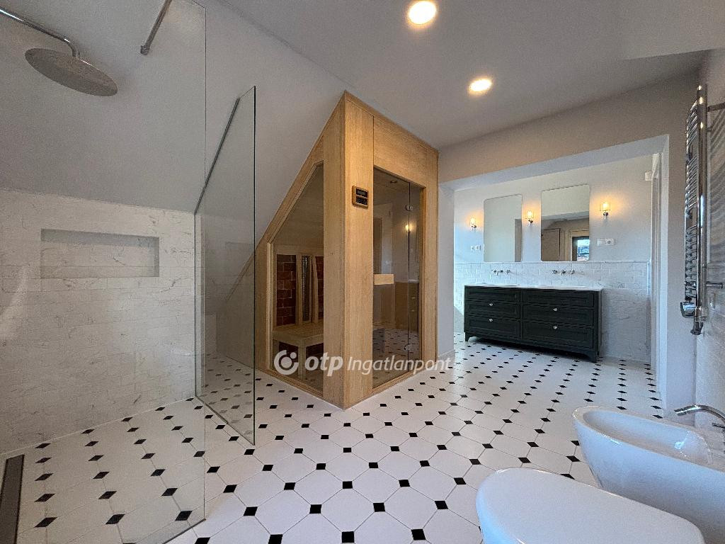 A tágas, 65 m2-es amerikai konyhás nappali fényárban úszik, a felső szinten található a szülői hálószoba gardróbbal és a fürdő szaunával, valamint egy további saját fürdőszobás háló. Az alsó szinten fitneszterem, mosókonyha és garázs helyezkedik el.