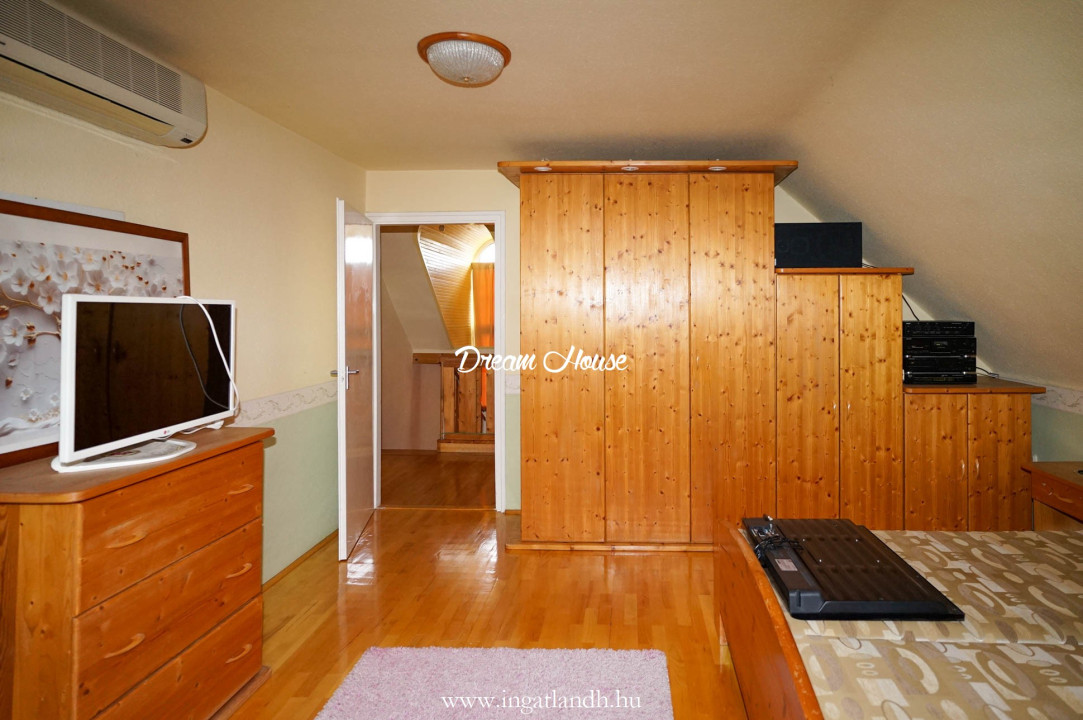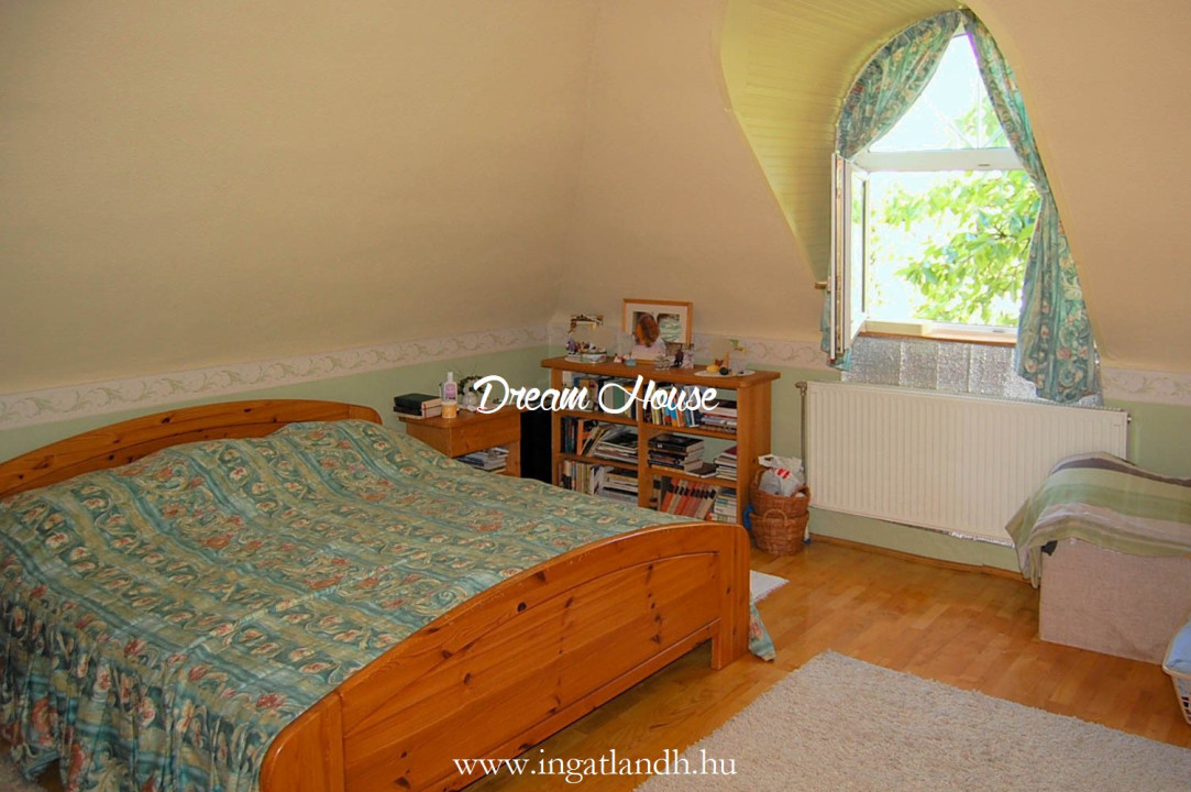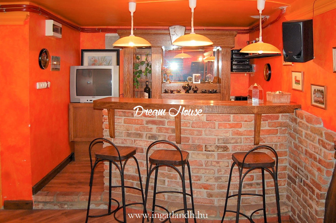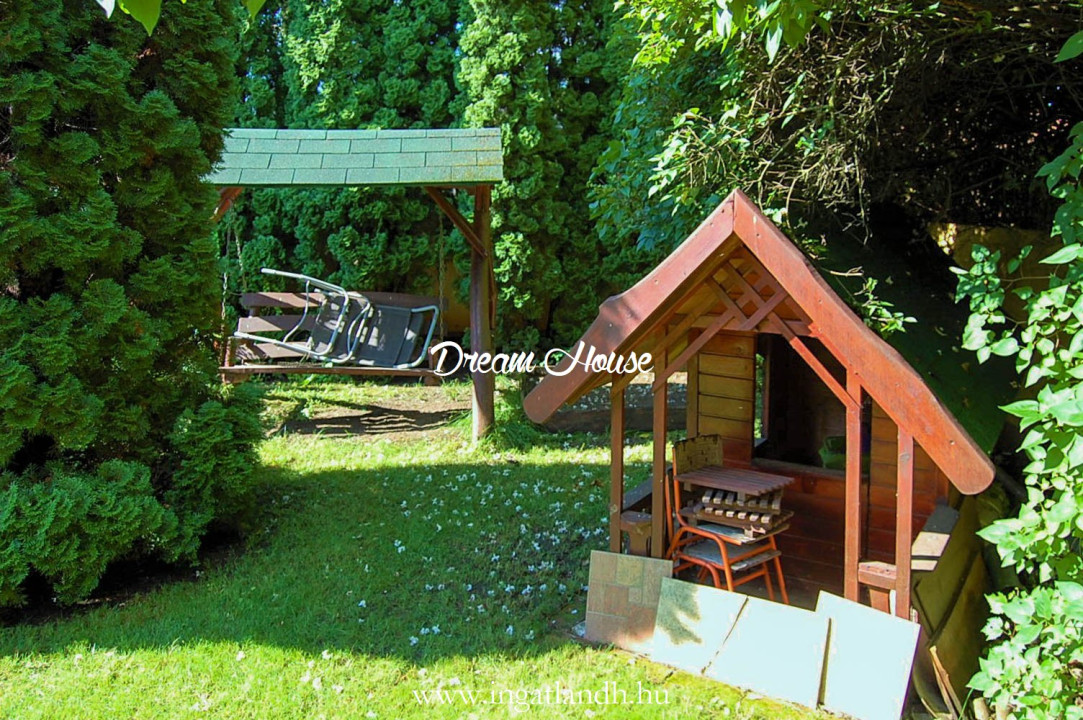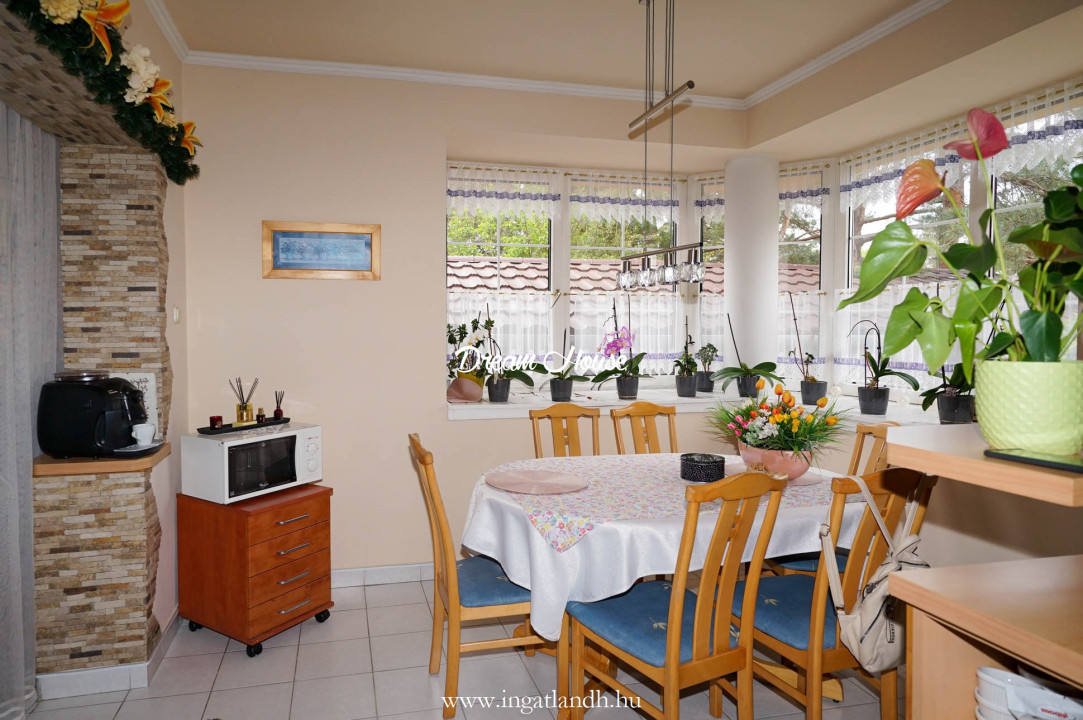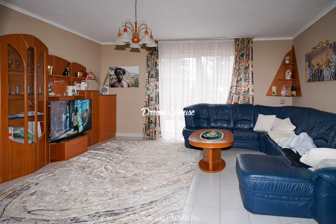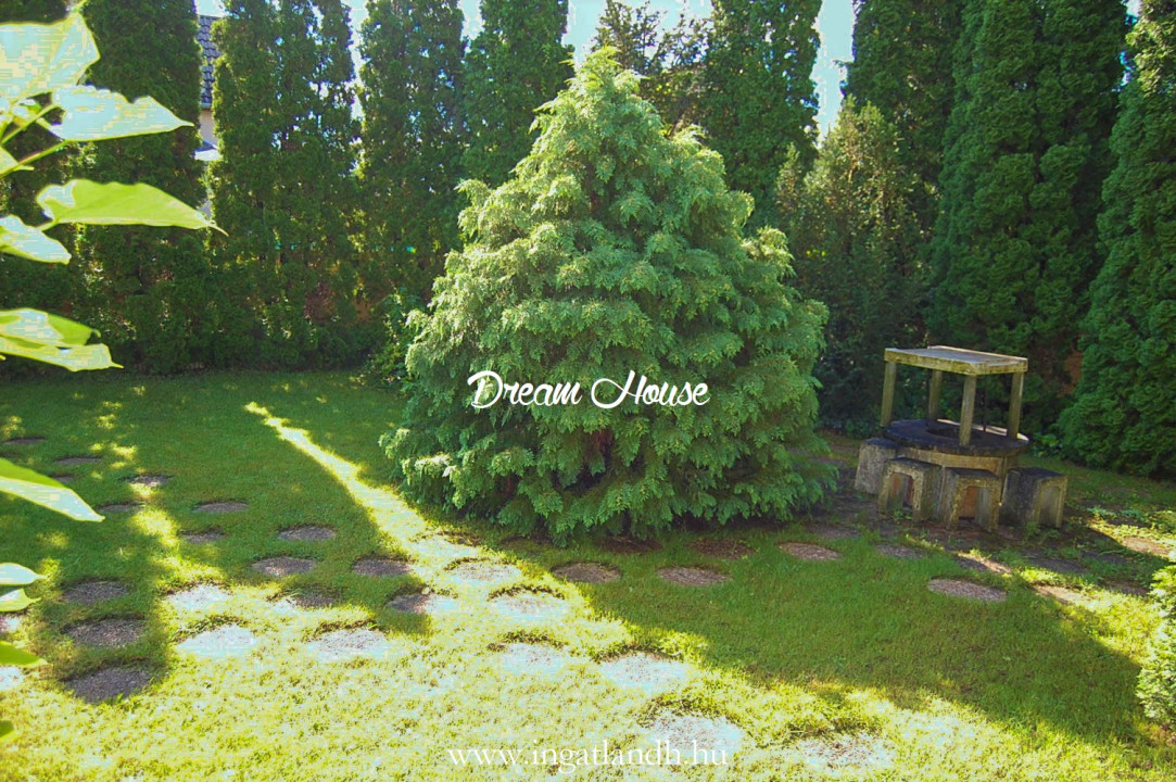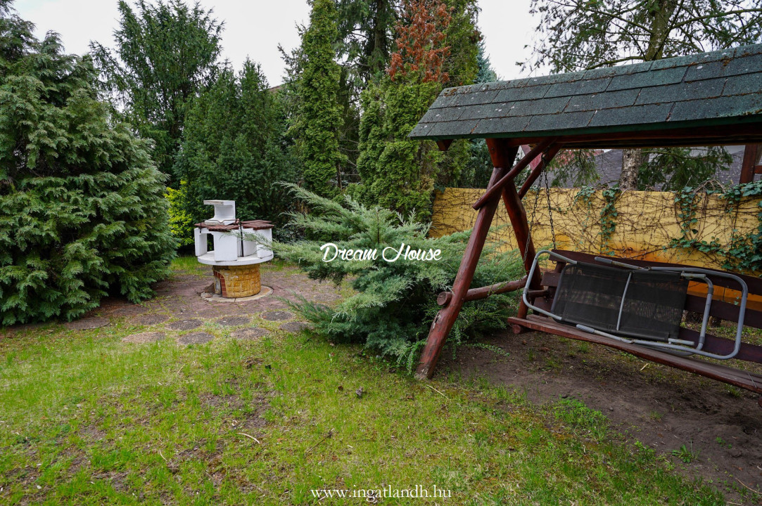 A szigetelt, téglaépítésű, szintes, szép állapotú, 165 nm alapterületű családi ház egy 500 nm-es parkosított, öntözőrendszerrel ellátott pihenőkerten helyezkedik el. A kellemes hangulatú udvarban kerti tó, szalonnasütő és egyállásos garázs is található, a ház előtt pedig két autó számára kialakított parkoló.