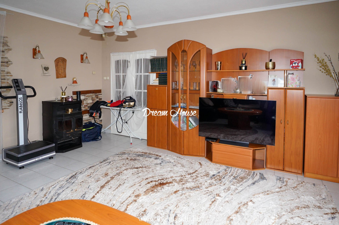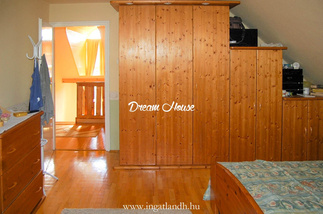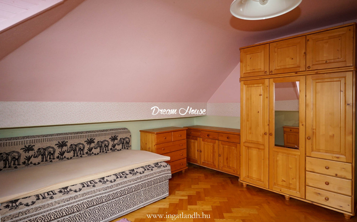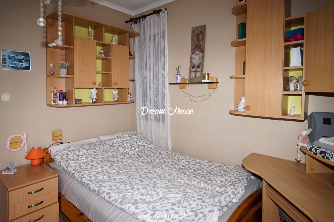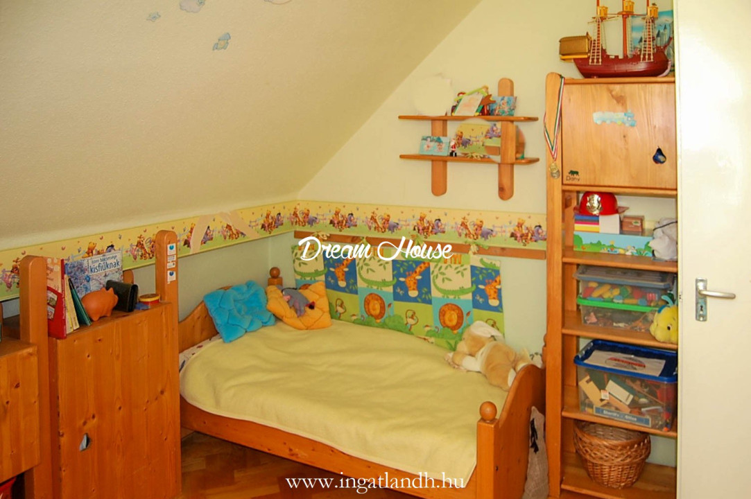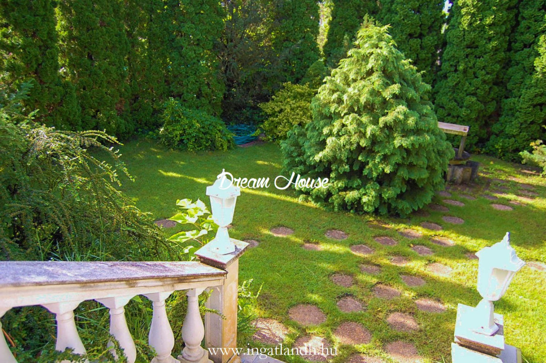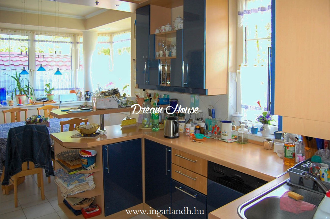 A szigetelt, téglaépítésű, szintes, szép állapotú, 165 nm alapterületű családi ház egy 500 nm-es parkosított, öntözőrendszerrel ellátott pihenőkerten helyezkedik el. A kellemes hangulatú udvarban kerti tó, szalonnasütő és egyállásos garázs is található, a ház előtt pedig két autó számára kialakított parkoló.