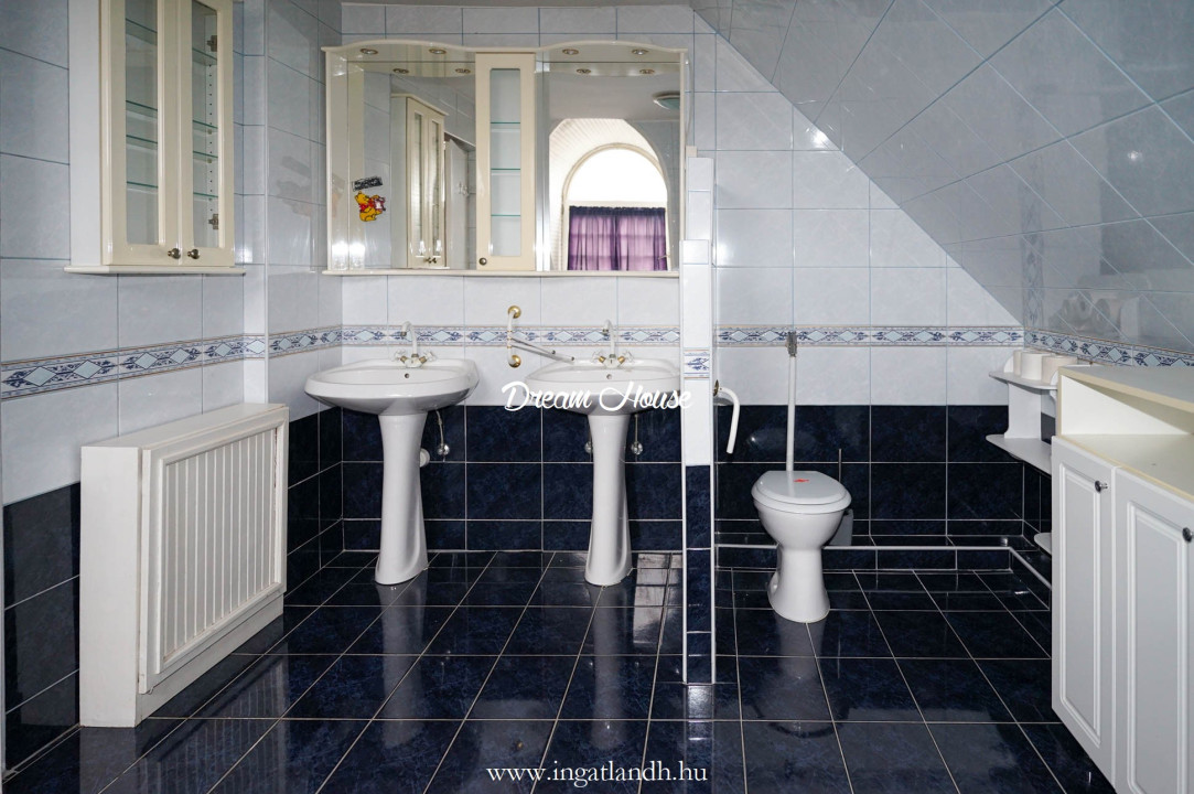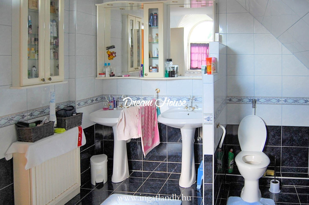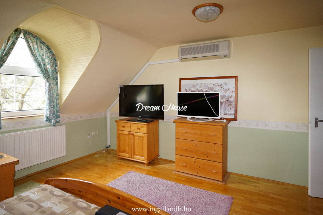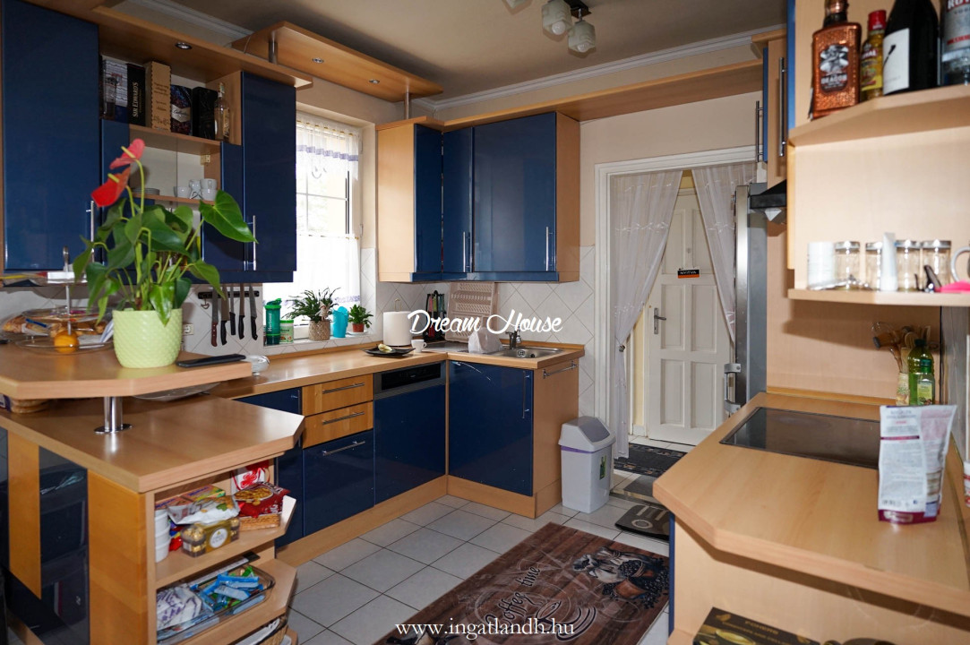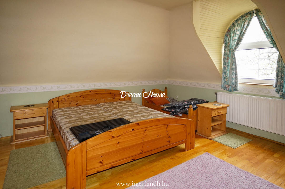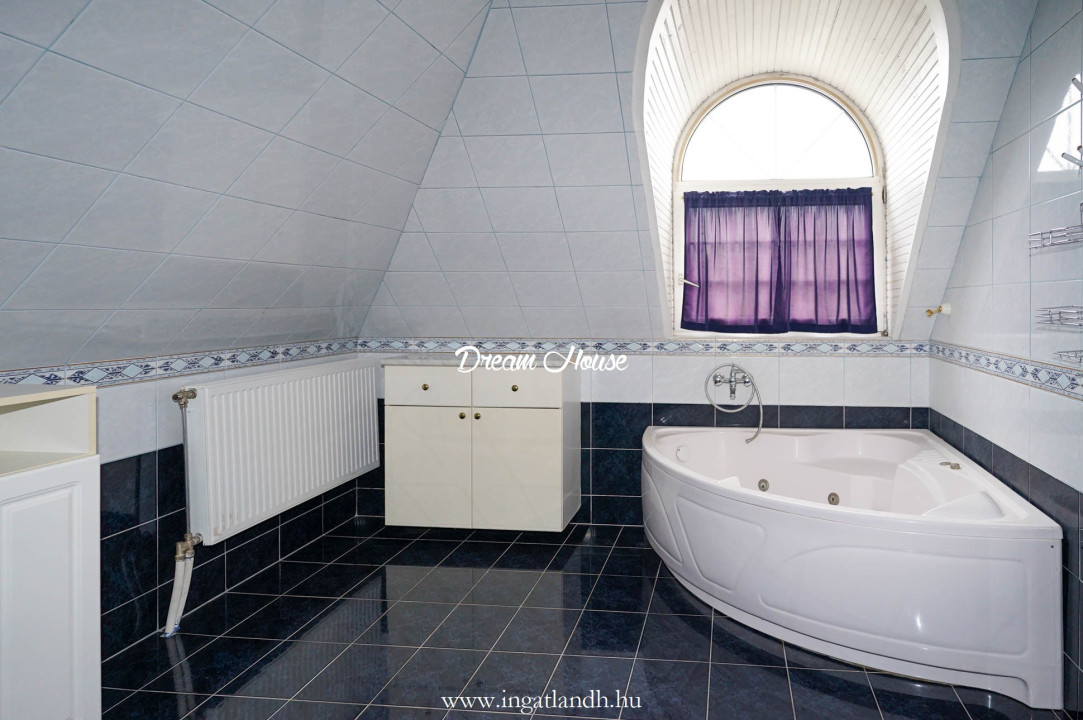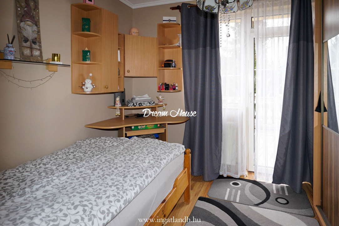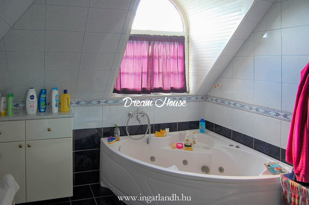 A szigetelt, téglaépítésű, szintes, szép állapotú, 165 nm alapterületű családi ház egy 500 nm-es parkosított, öntözőrendszerrel ellátott pihenőkerten helyezkedik el. A kellemes hangulatú udvarban kerti tó, szalonnasütő és egyállásos garázs is található, a ház előtt pedig két autó számára kialakított parkoló.