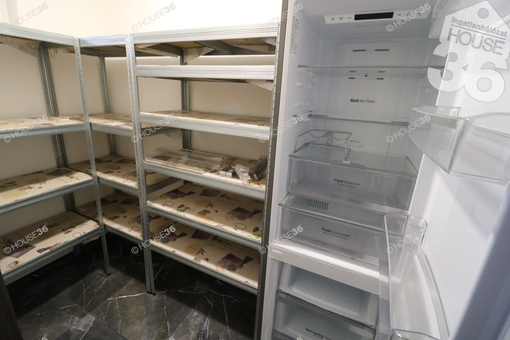 Amerikai konyhás nappali teljes gépészettel és bútorzattal, beépített szekrényekkel rendelkező gardróbszoba, 2 db hálószoba, spájz, tároló, műanyag nyílászárók redőnnyel, padlófűtésrendszer, klímaberendezés, riasztórendszer, elektromos kapu, elektromos garázskapu stb.