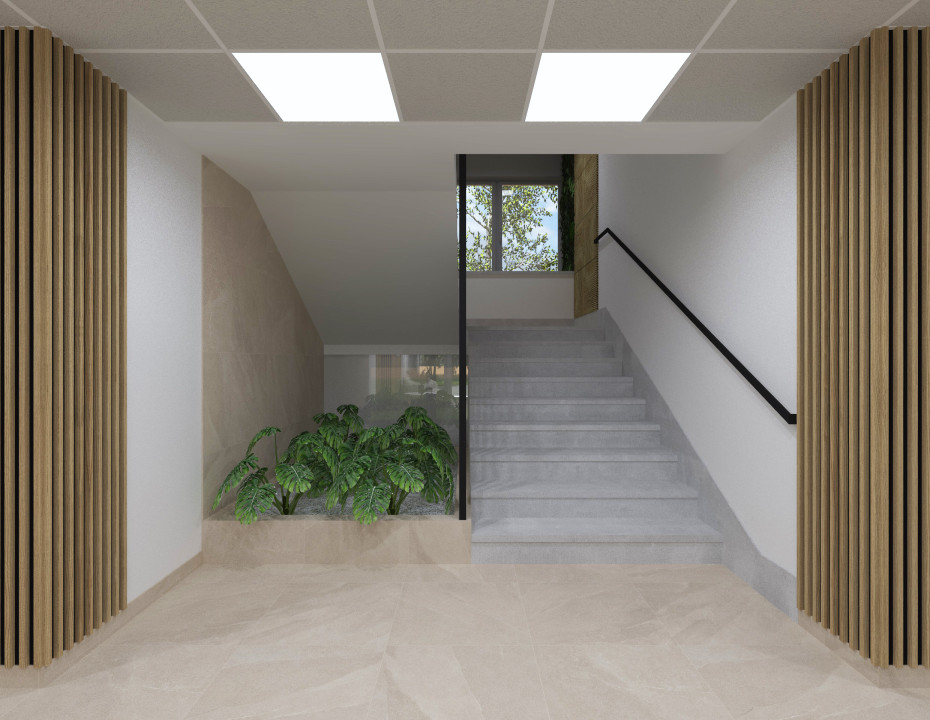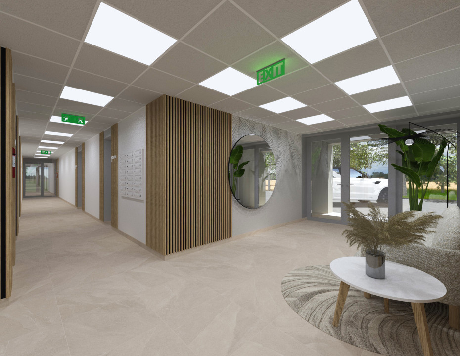 Elegáns, minőségi anyaghasználat és a praktikus elrendezés együttesen teszik az irodaházat egyedülállóvá a környéken.